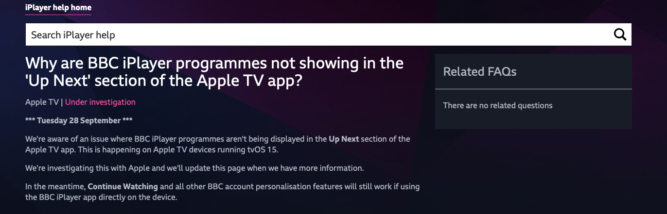 I reset my Apple TV HD back to 14.7 from 15.1 beta 1 and as 15.1 didn't resolve it. They released beta 2 yesterday however I've not updated back to this. I have however updated my iPad to iPadOS 15.1 beta 2 and the tv app still doesn't fill BBC programming in the up next. The bug report I sent on the 16th is still open and showing that other users are reporting.