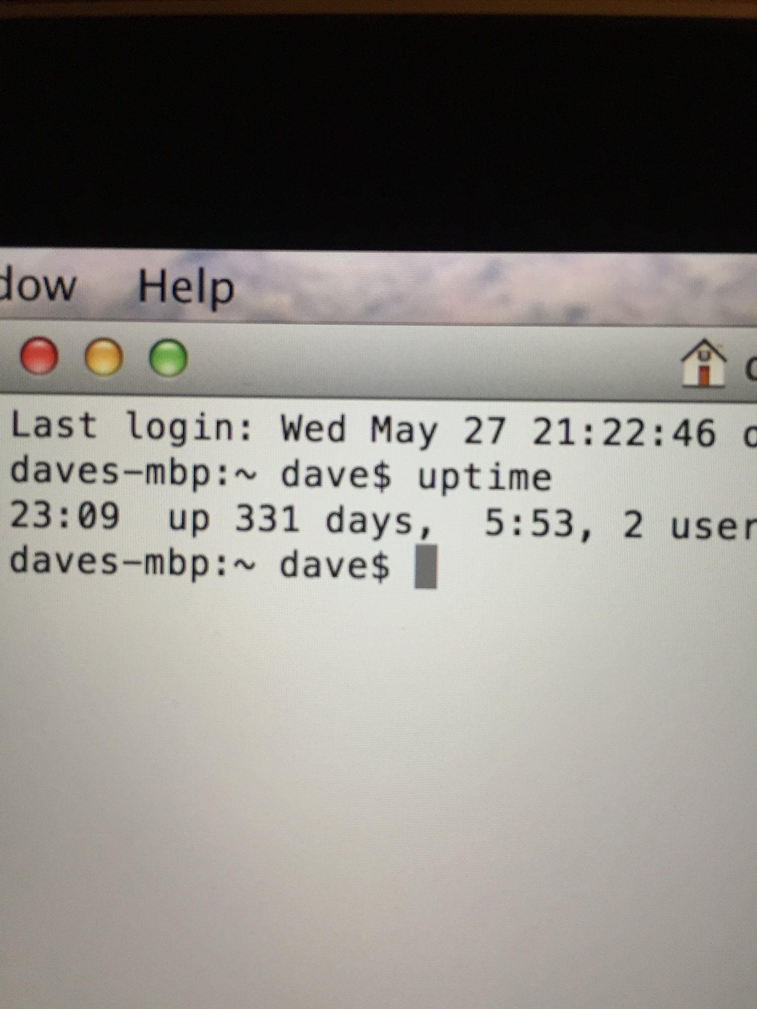 Many years ago I remember getting ready to upgrade macOS on my MacBook Pro. I wondered how long it had been since I restarted. I went into the terminal & typed "uptime." Well it was almost a year since I last restarted. I took a pic for posterity. That tells you how stable macOS & Apple hardware can be.