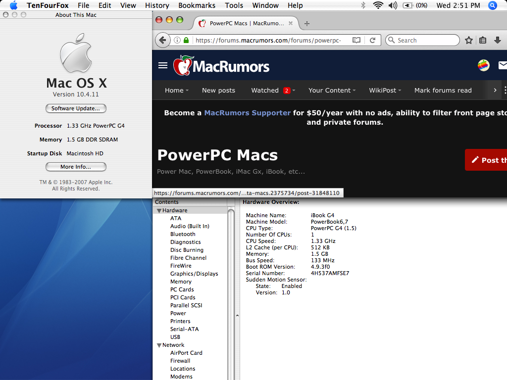 It's been quite a while since I last posted, but I once again find myself with another PowerPC powered rig, and this one hits much closer to home. I used to have an iBook G4 when I was younger, unfortunately I destroyed that one long ago being young and not knowing what I was doing taking it apart and back together. I while ago I aquired another iBook G4 from an eBay auction run by a Goodwill, it was an untested unit and I won the auction for $20 plus shipping. I received it in great condition, and it powered on to an old Tiger install. I recently finally decided I'd like to make this my "dream build" iBook g4, and have started with throwing in a 1Gb stick of ram. This unit is a little newer and faster than my old a1054 12", this new one is an a1133 2005 model with slightly bumped clock speed and 500mb of on-board memory. I'm hoping I can find a new battery to install, does anyone know where I could locate one? I'm also looking at installing an SSD in the future to replace the old factory 40gb hard drive. Lastly, here is a screenshot I took with the specs, and it running TenFourFox wonderfully.