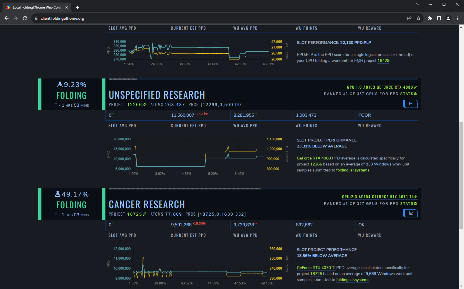For the past couple of years, I’ve been running Folding@Home overnight (off-peak electricity hours) and only during the winter months. Originally, the config included dual GPUs of the RTX 3080 family. I recently upgrade to RTX 40 series and somewhat disappointed (as well as somewhat baffled) at the performance with Folding@Home / F@H. While not an essential task, I am extremely curious as to why newer generation GPUs are performing poorly… If that’s even what’s happening.
