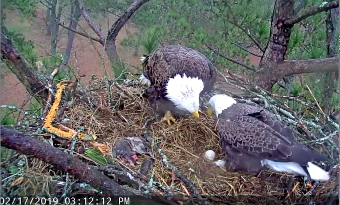 Some cool video from earlier today of the pipping process of one of the eggs. The parents do know they have a hatch in progress now, so they're pretty excited, while taking care to keep turning both eggs and incubating them but switching places a few times more often than usual and taking even more care how they place their feet and beaks as they take their turns checking hatch progress. No rest for the weary tonight.