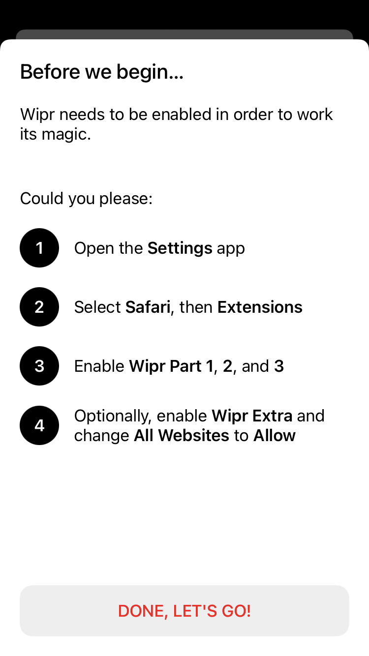 After switching my ad-blocker for macOS last night to Wipr, I thought I'd give it a go on iOS today too, to replace the two ad-blockers I'd run for the last couple of years- BlockBear and Purify- as neither has been updated for years.