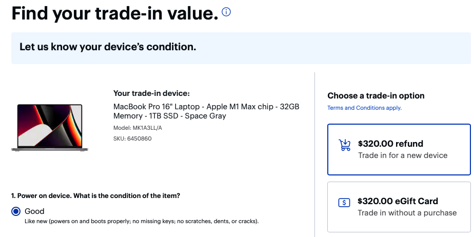 Apple also offers its own trade-in program for Macs and other devices, so it's worth comparing trade-in values to determine what the best option is for you. Private sales can also frequently yield higher values for a given model, though that can come with more hassle and less security than a retail trade-in partner like Best Buy or Apple, so you need to weigh priorities when deciding how to upgrade.