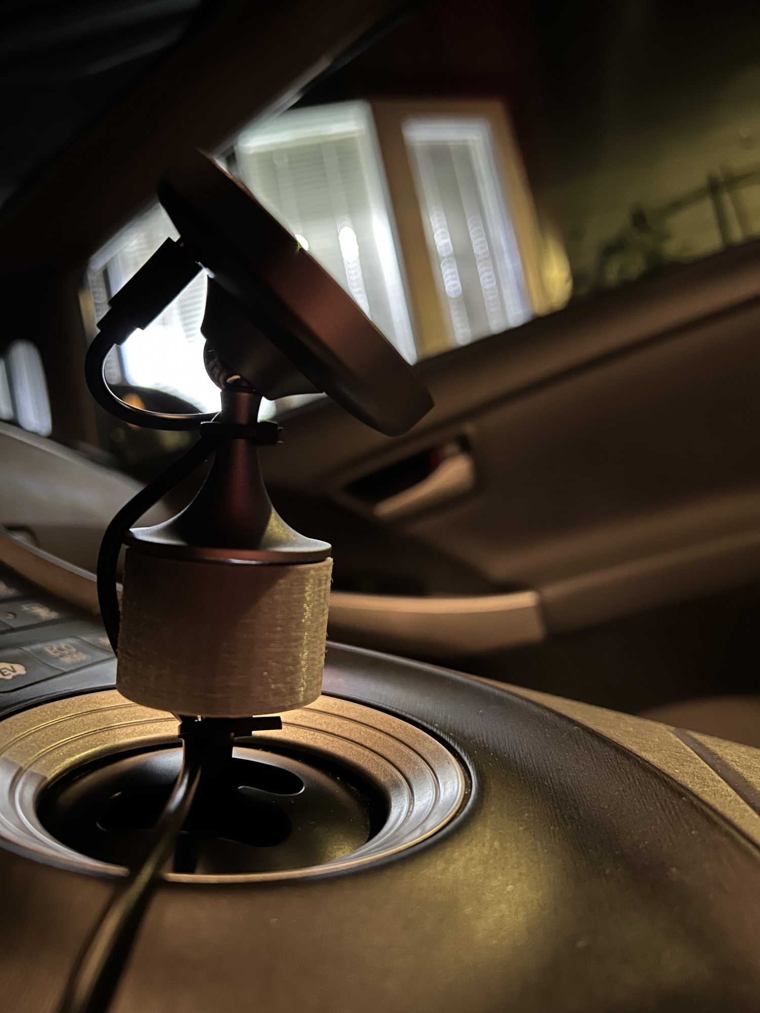 CoolWell, I 3D printed a small cylindrical part to thread onto my shifter rod and mounted the Spiegel wireless car charger to it.