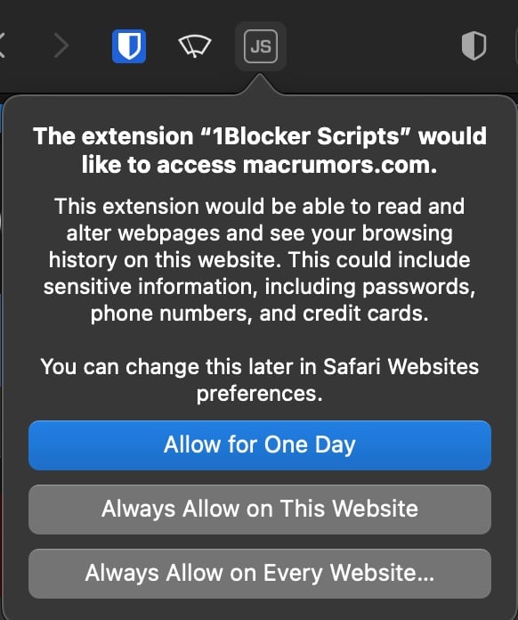 Regarding "1Blocker Scripts", the Safari toolbar icon looks like a square with JS inside of it. This is the Extension where I limit its functionality. I only allow it to work on YouTube.com. For all other sites, the default action is to DENY. You can configure this in Safari Preferences.