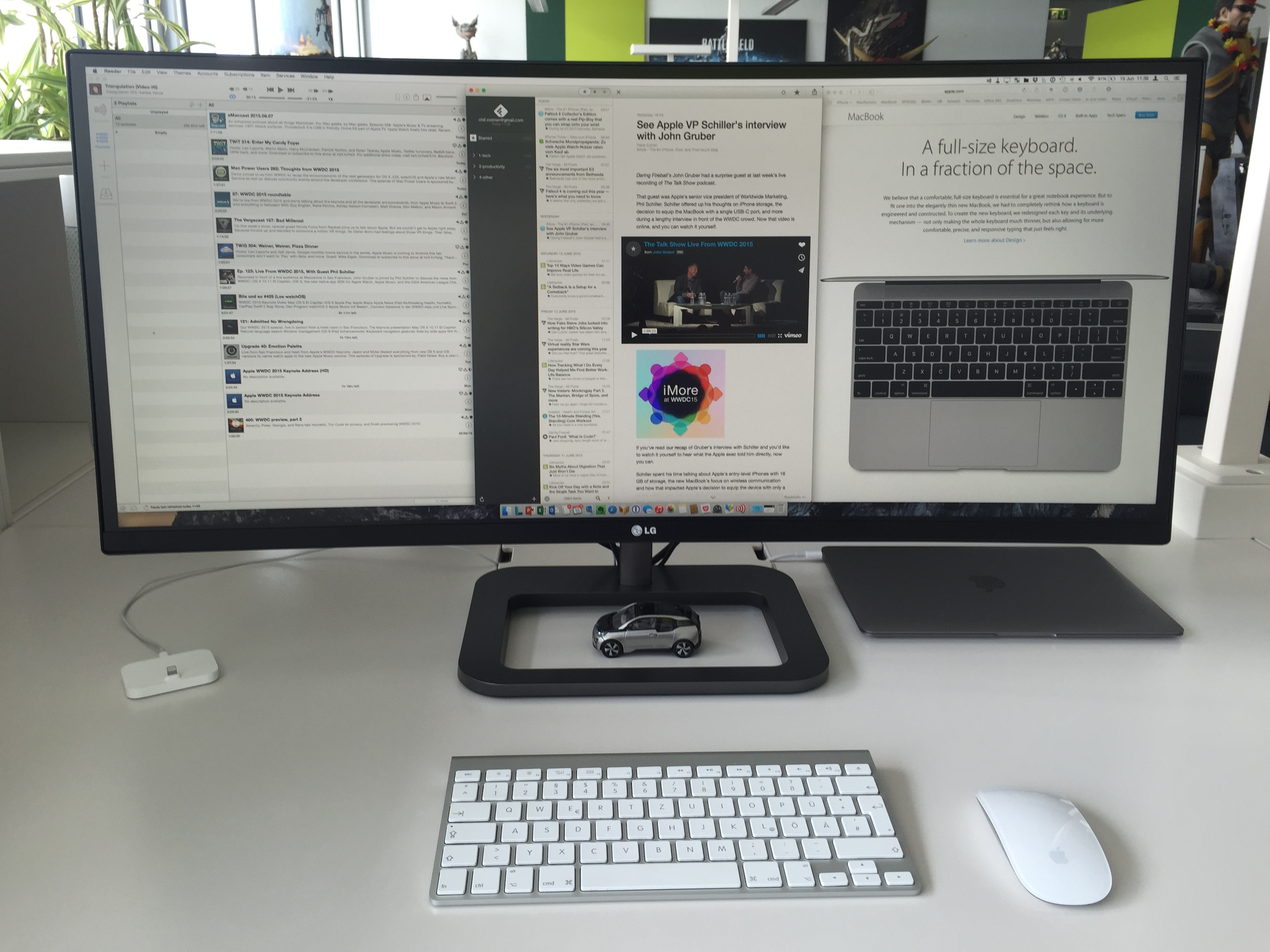 LG curved is fantastic with the Macbook. Have one at home and one at work. The one plug design really delivers and having three windows open on the curved display is amazing for getting stuff done. I use Bettersnaptool to organise them quickly in three rows.View attachment 574508
