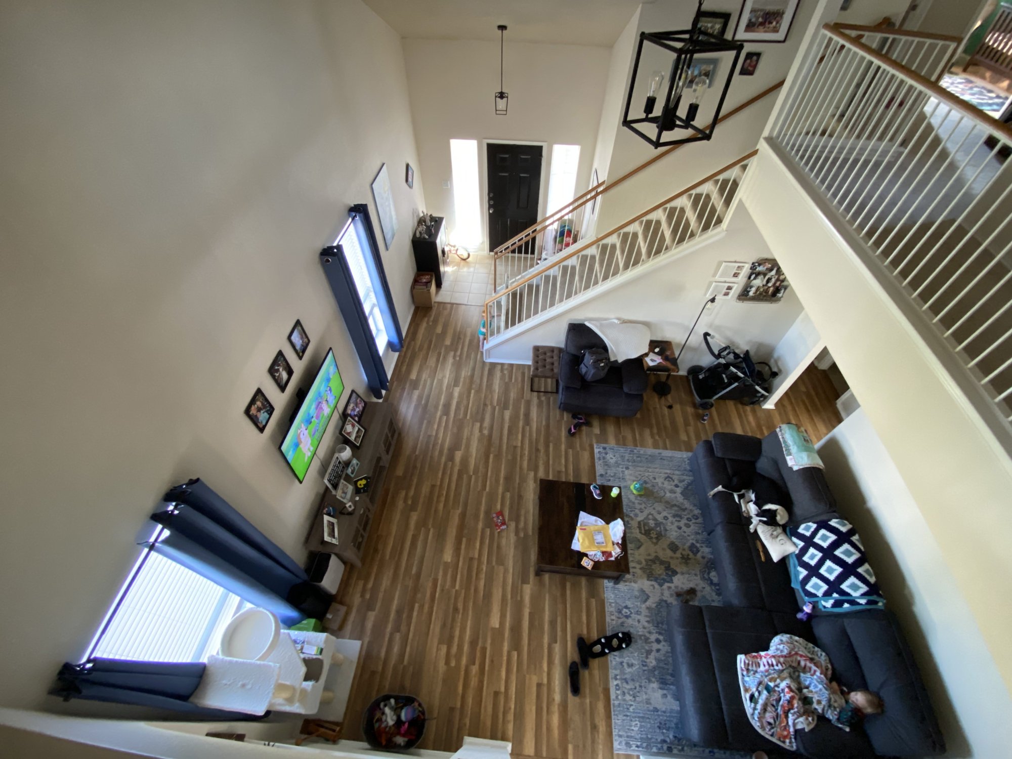 Idea 4: if you would rather build yourself the traditional Receiver + "dumb" speakers setup, your pictures imply that you could possibly run your wires for the rears around the far right wall (and stairs) to get back to the seating area. There's lots of products to hide these including hollow baseboards and/or various kinds of strips (