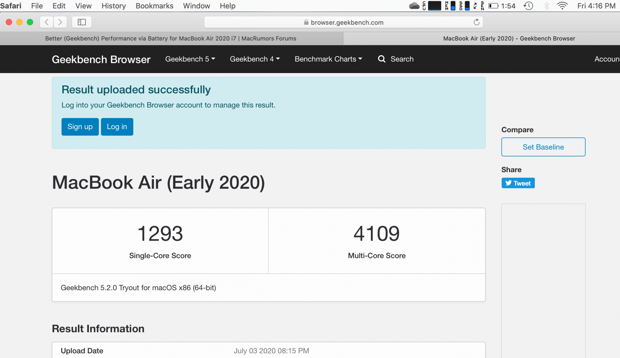 When on battery and I am not sure at what point but lower battery it seems not to be checking stuff in the background like Photo, Calendar, Accounts, System Update, Windowserver, etc. Seeing I was 98% CPU usage on battery I just ran the GB test while on battery and only 2 hours left of charge 1293SC 4109MC. Then I plugged it in and all of a sudden I am down to less than 65% CPU because I am on power and its checking everything in the background. If I ran the test now it would be total crap like you posted.