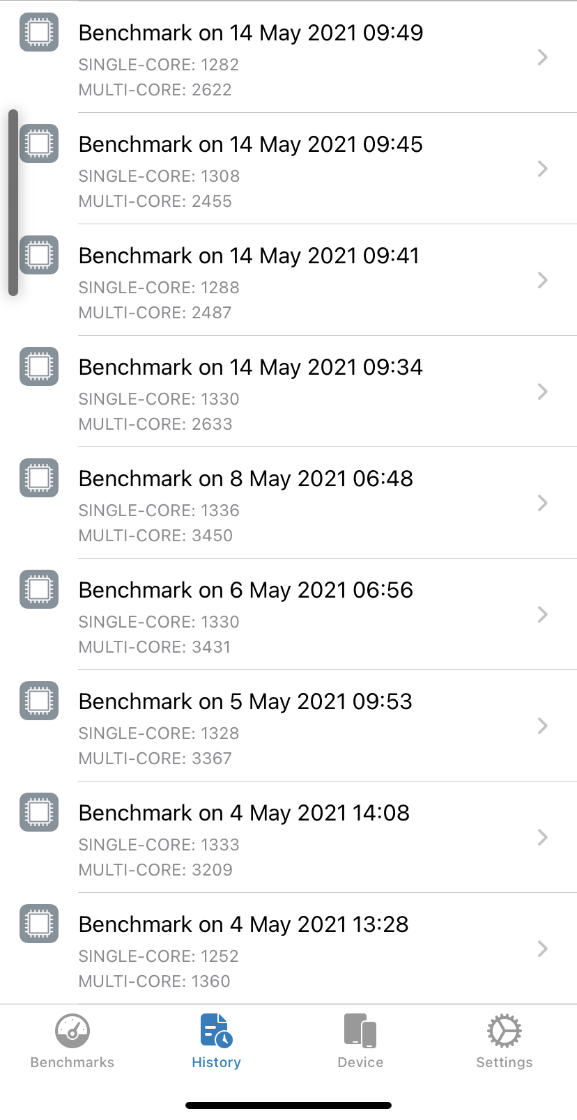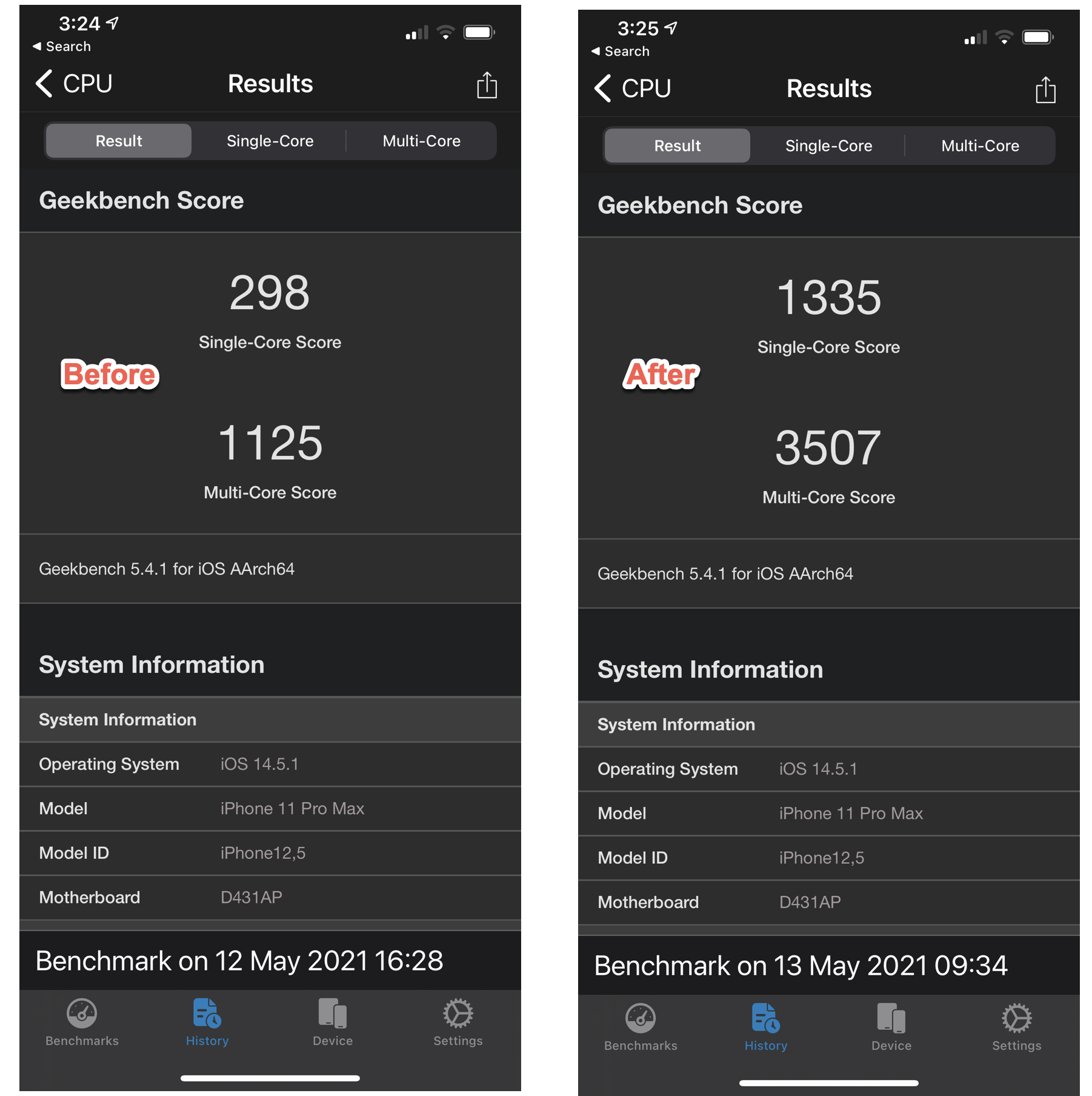 Here's my three in a row. iPhone 12 Pro Max, 14.5.1, uptime 22h 6m.I have tried the hard reset trick numerous times. The geekbench scores return to normal after a reboot, but if I test again a few hours later they are back down.