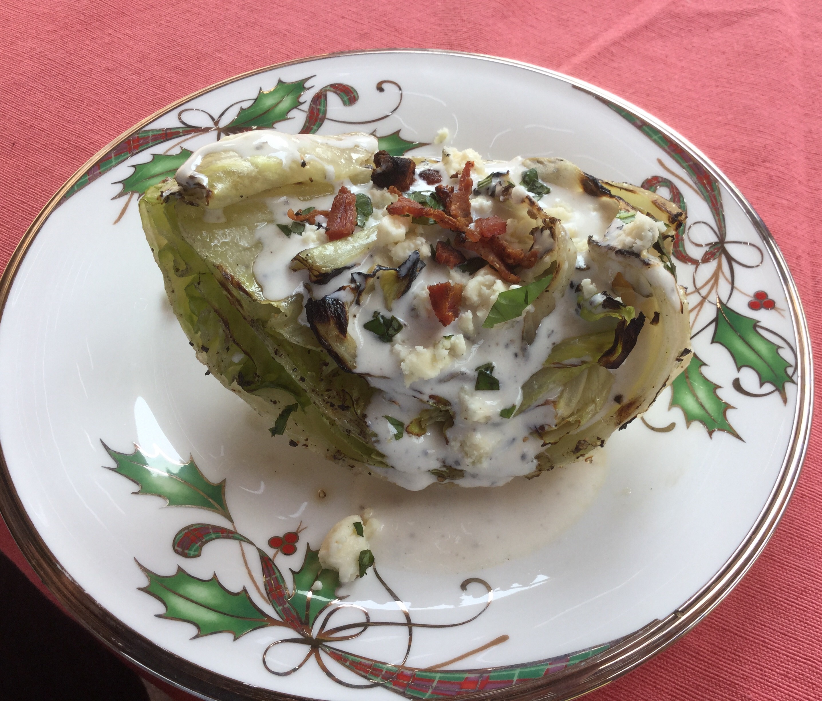 The first is quartered iceberg grilled with mesquite (for the smoke and marks) then chilled. The dressing is just sour cream and buttermilk, salt and pepper. It is topped with blue cheese, fresh basil, and bacon. It really was really better than it looks. The lettuce took the mesquite smoke really well.