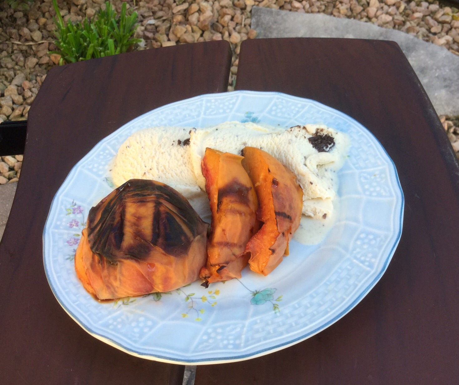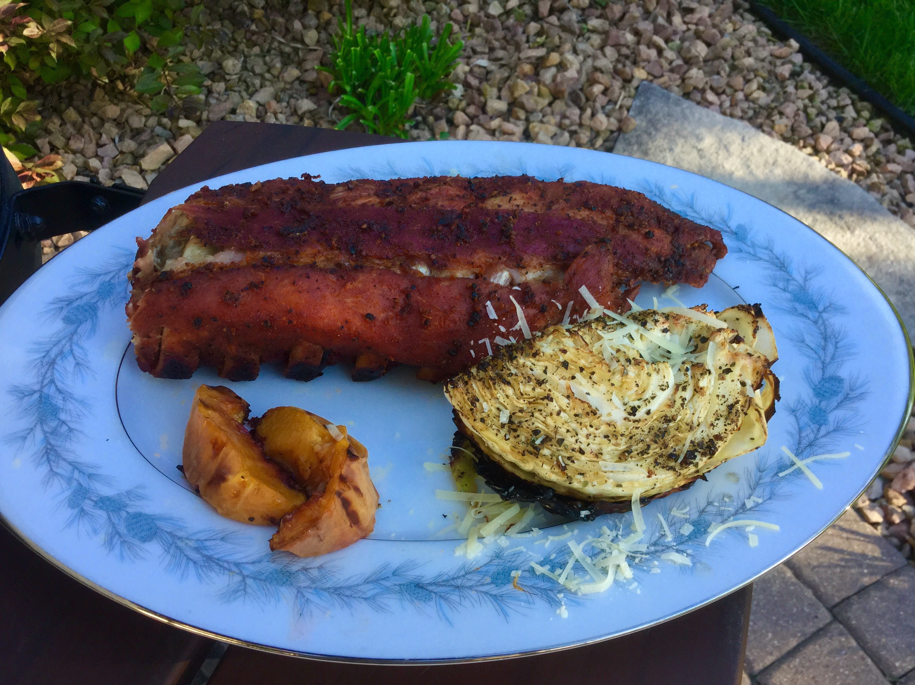 Looks yummy!Regular old ribs with grilled cabbage (drizzled with olive oil and lemon), and grilled peaches with cookies & cream ice cream.