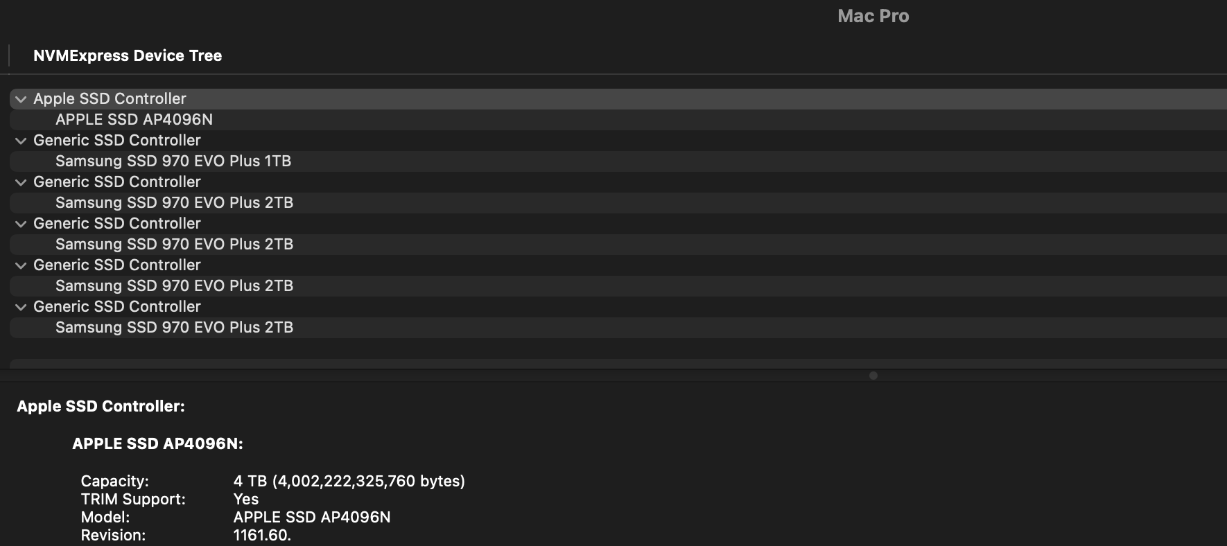 I have a 7,1 2019 Mac pro with macOs Big Sur 11.1. with 8 PCIe SSDs on Sonnet cards. Some of the SSDs are Samsung 970 Evo plus, and some are HP EX950s.