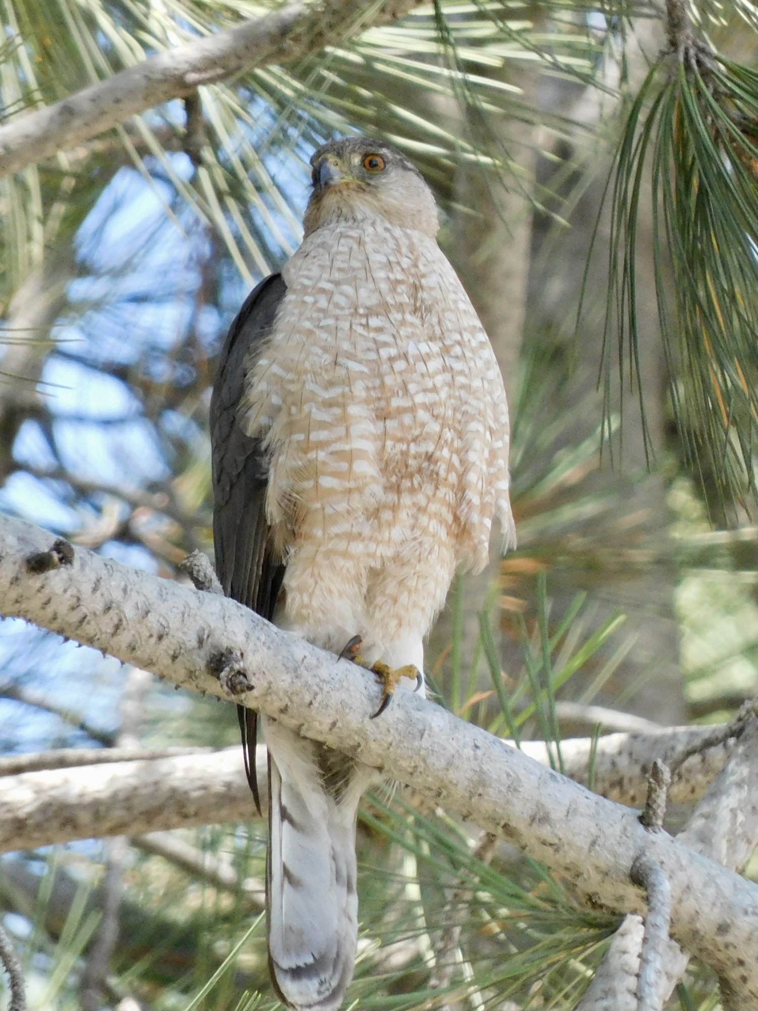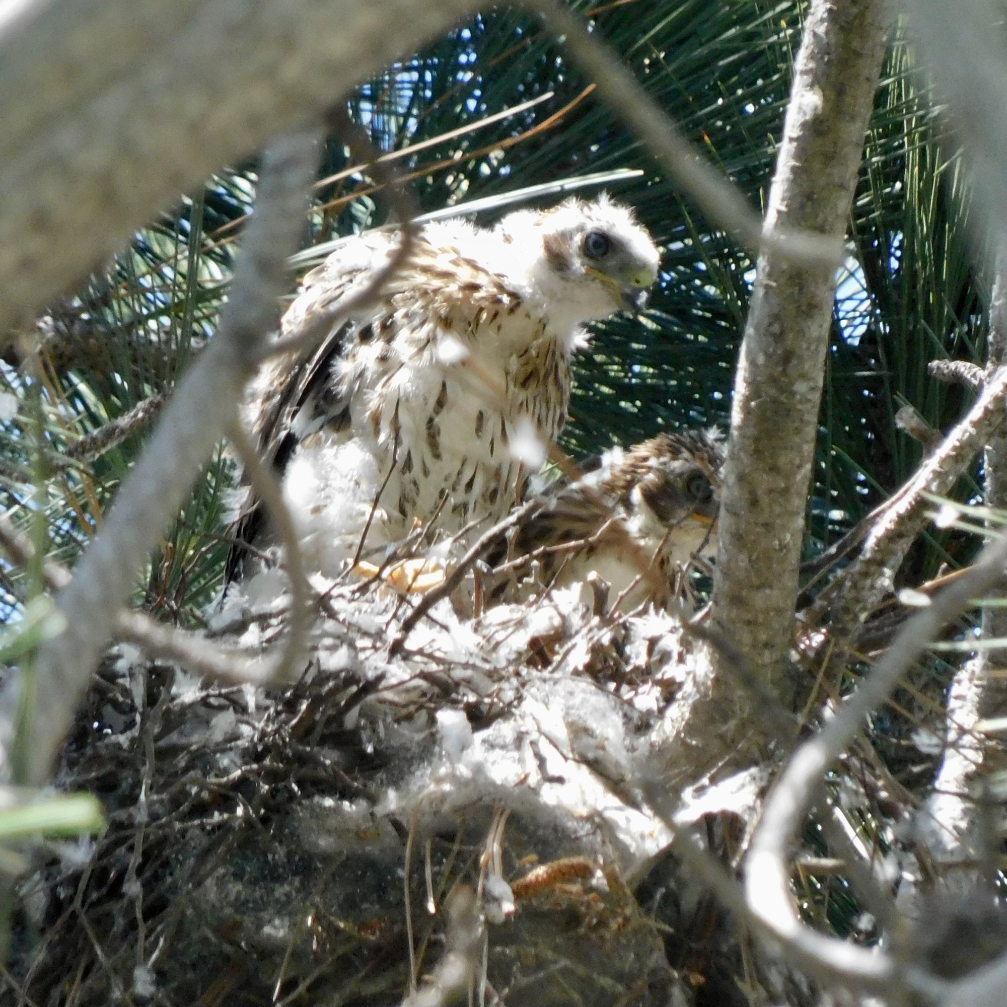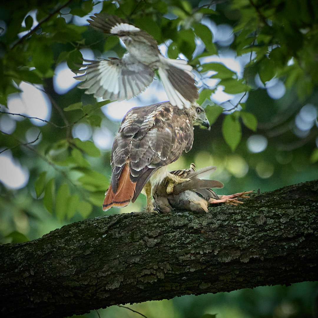 I watched for awhile and the smaller bird gave up, and then raptor tucked into to his dinner. Every now and then he'd check on me, but then back to a tug and another morsel, with feathers drifting down from the branch.