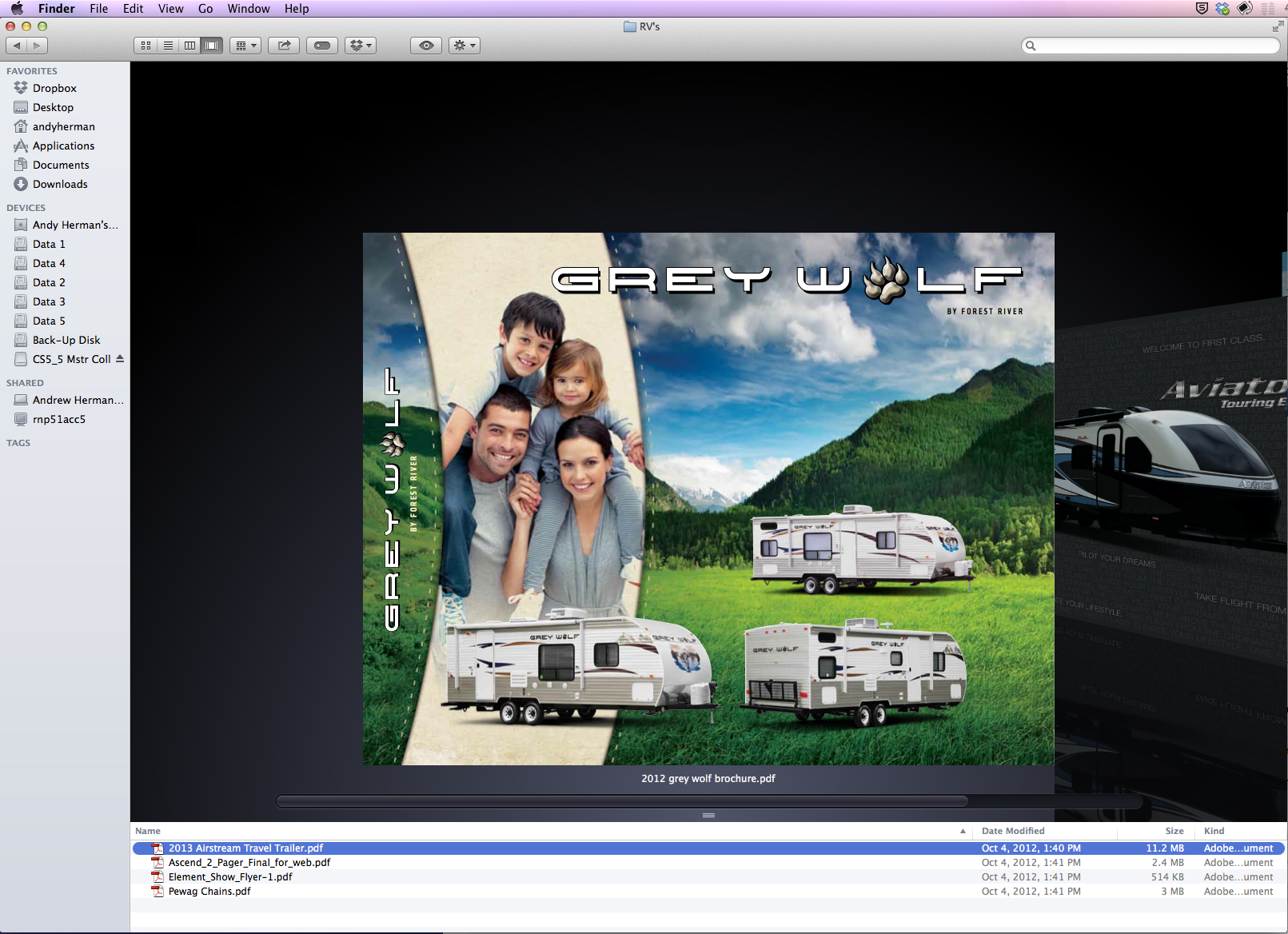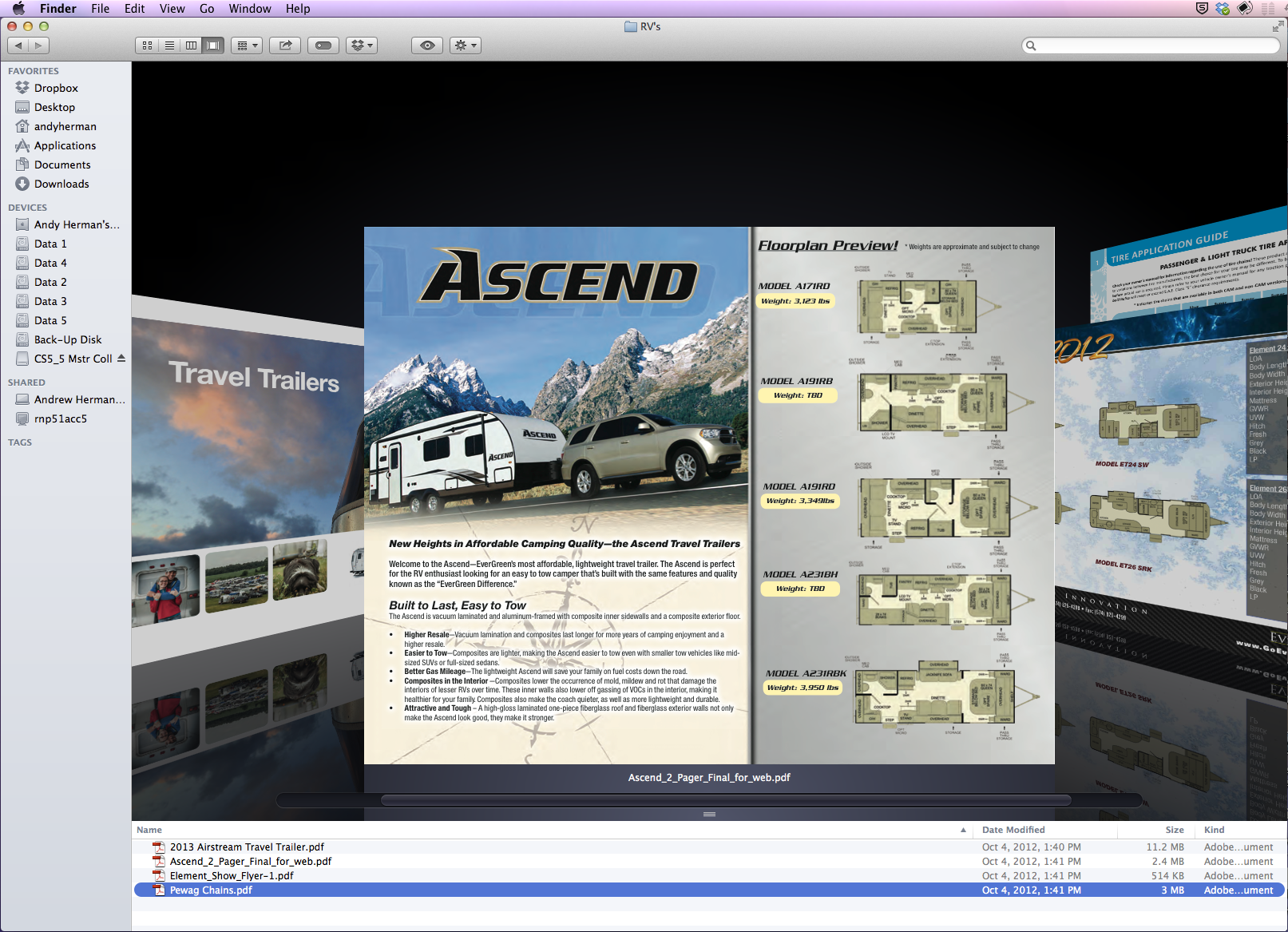 For example, I had been looking at some RVs and downloaded the brochures for those RVs. In Cover Flow the file name shown in the finder is "2013 Airstream Travel Trailer.pdf". However, the image shown in Cover Flow is of the "Grey Wolf" travel trailers brochure.