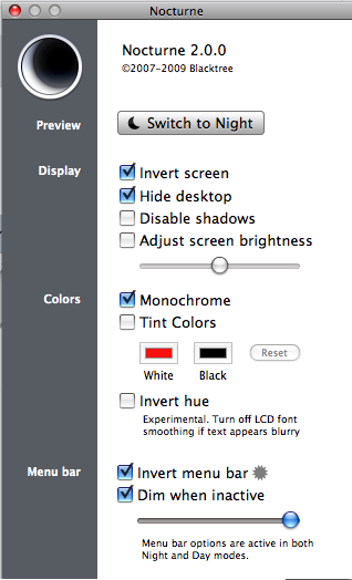 The main reason I used this theme was the black menu bar. I like to use the black 2D dock, and the black menu bar just fits in really well. But I don't like the black window frames because you can't read the titles and it just looks odd with some applications. So I uninstalled the black theme and used Nocturne 2.0 instead.