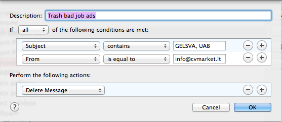 This is done with Rules and Mail doesn't have a blocking mechanism by default except marking as spam. You pop in "Rules" pane of Mail preferences and create a rule that looks something like that. It's very simple.