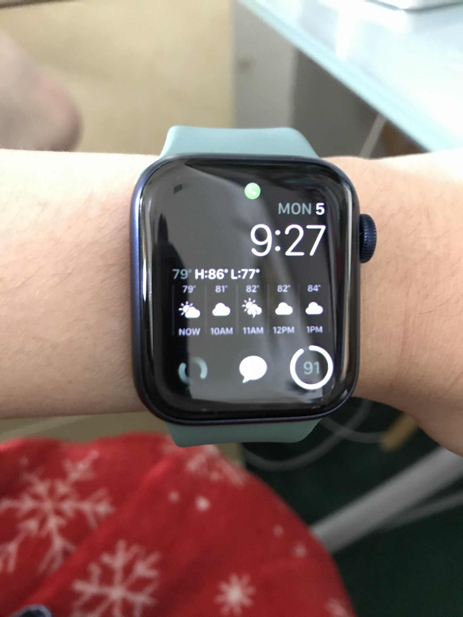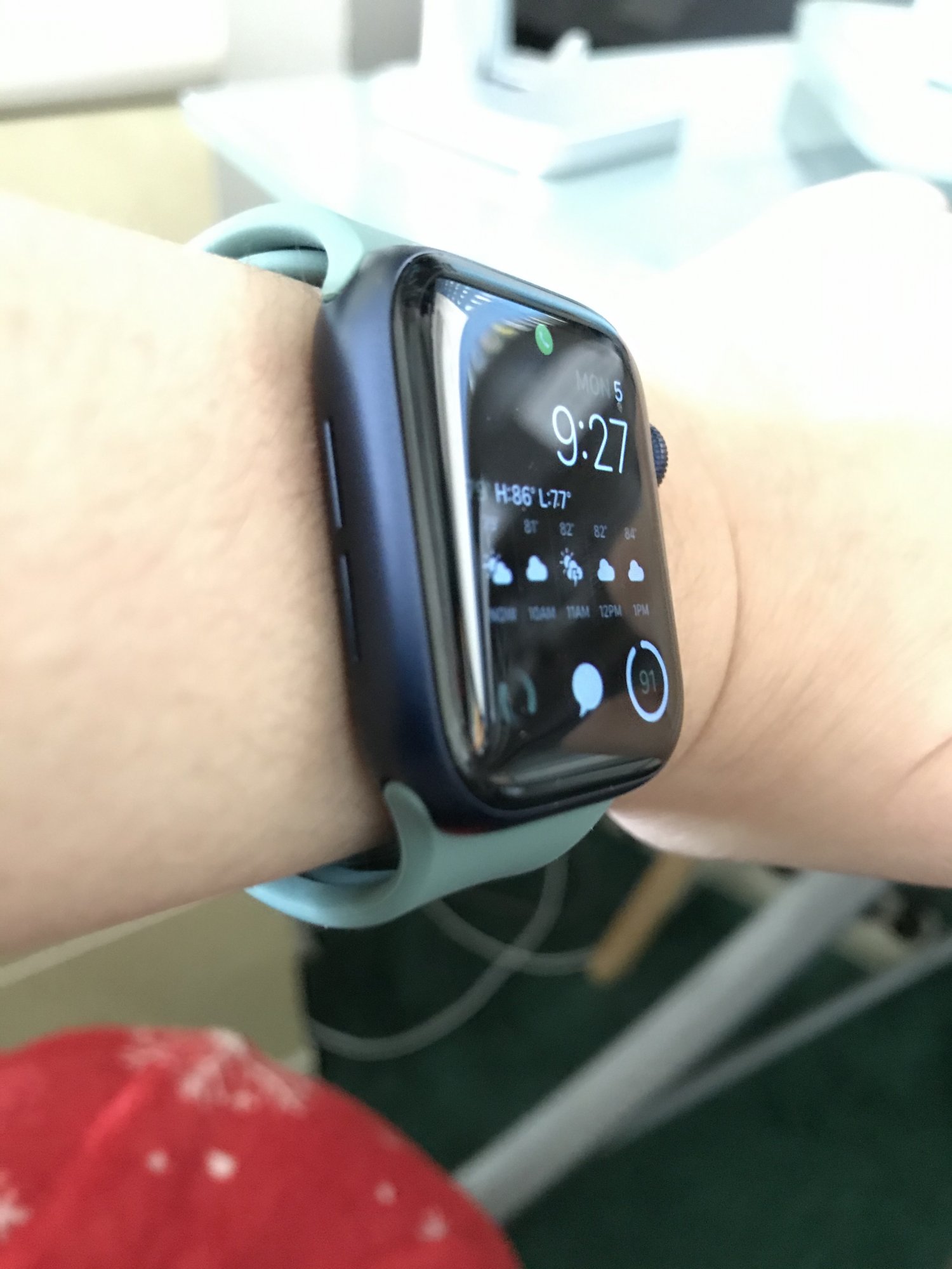I’m changing bands tomorrow. Here it’s on a ginger band with black scrubs. Sorry for the blurriness of the front camera.Can someone post some pics of the blue watch and how it works with dark gray / black clothing? I wear a lot of black but the blue watch is calling me.