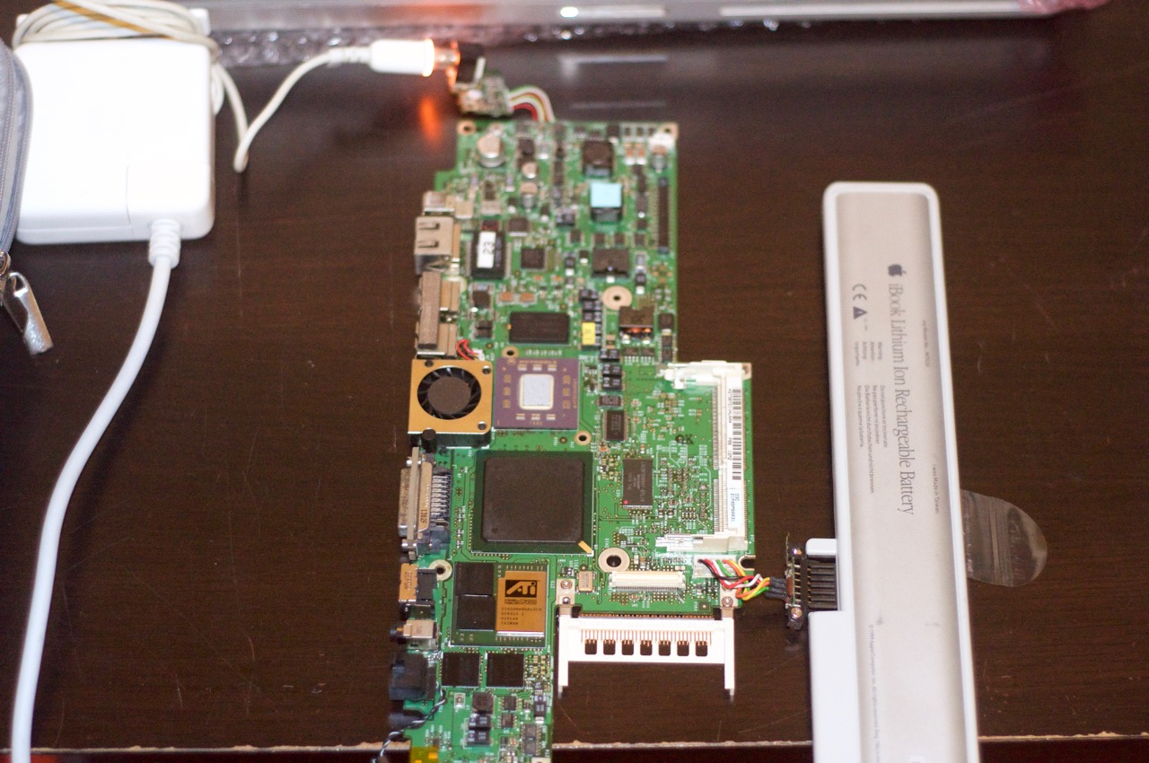 Here I am powering a 65 watt Titanium logic board, with DC-in and the charge connector, then left it like this to charge for a few hours (not running) and the original, non-rebuilt, iBook clamshell battery came back to life. The bulk of the original battery housing does not fit into the battery bay like it did with my naked rebuild in the earlier photo (a few posts back).