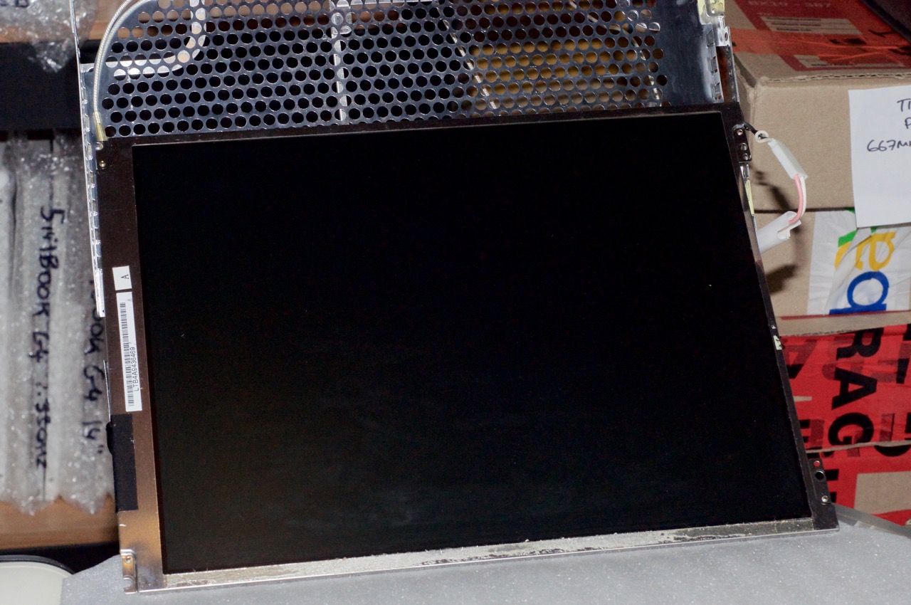 5. I then connected the broken PowerBook G4 12" panel to the backlight inverter and can see the backlight come on fine when I power on the iBook. I actually tested 3 different cracked 12" panels which I had on hand (2 from iBook G4s and one from the PBG4 12"). The PBG4 12" display was the winner in terms of backlight quality.