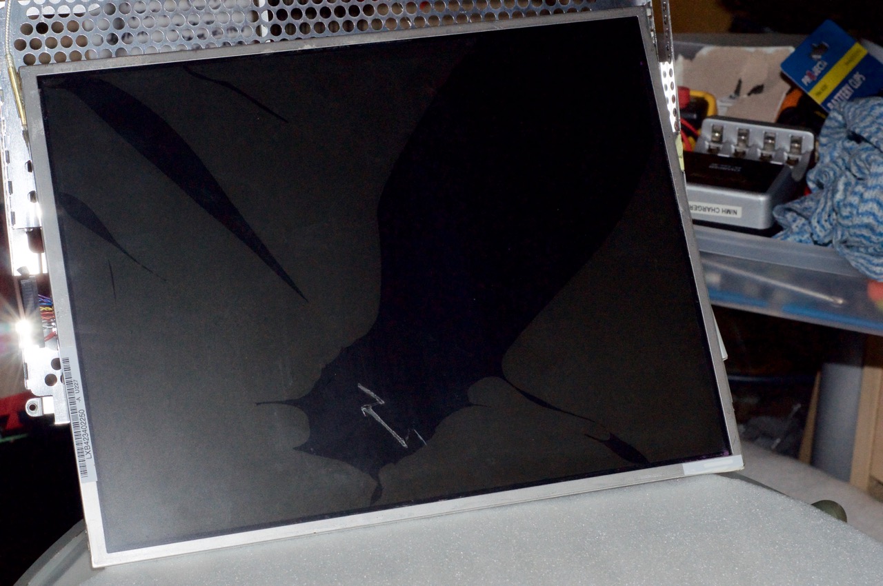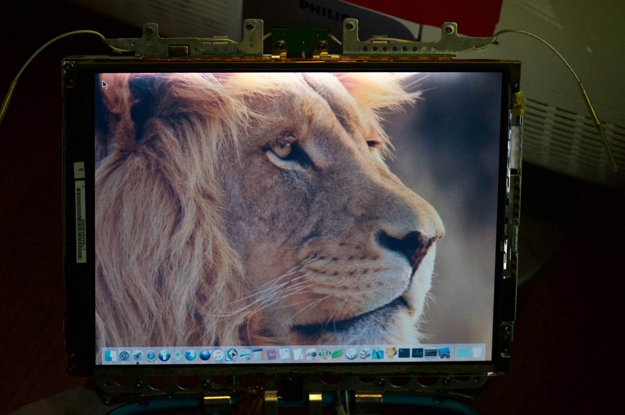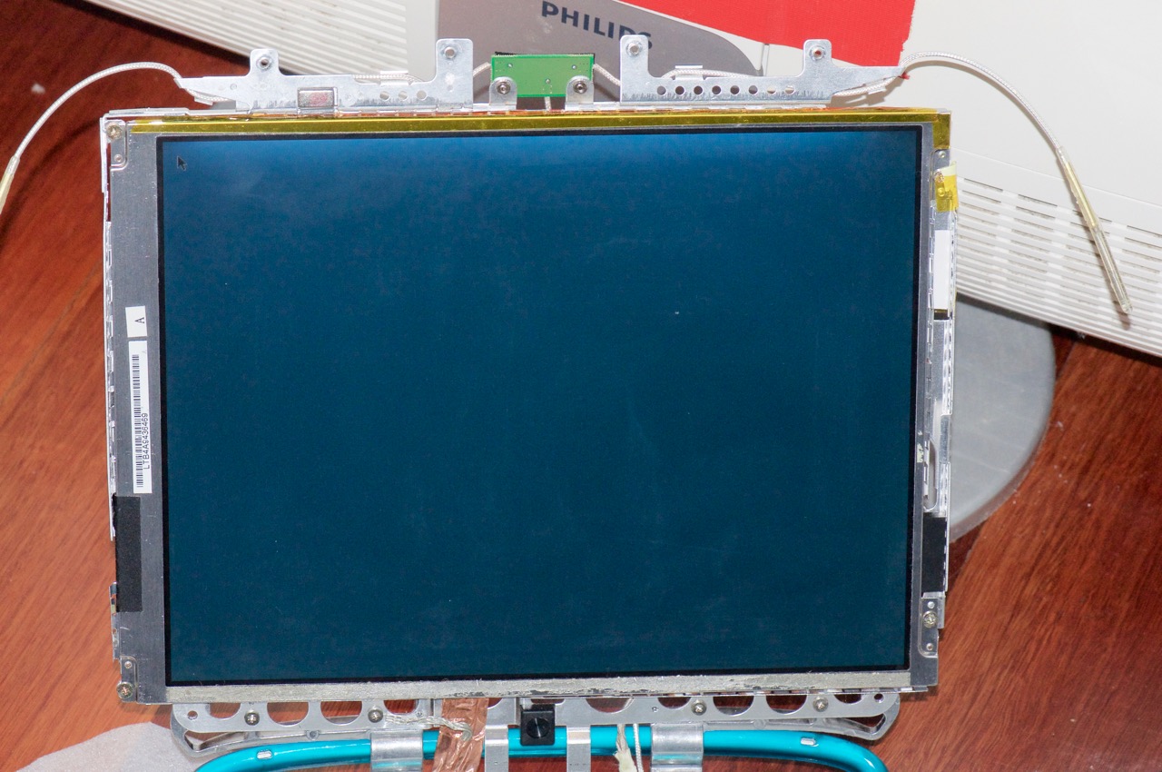 4. Here I've connected the original LCD panel to the backlight inverter and powered it on. The display is so dim it's hardly visible (with the camera flash on).