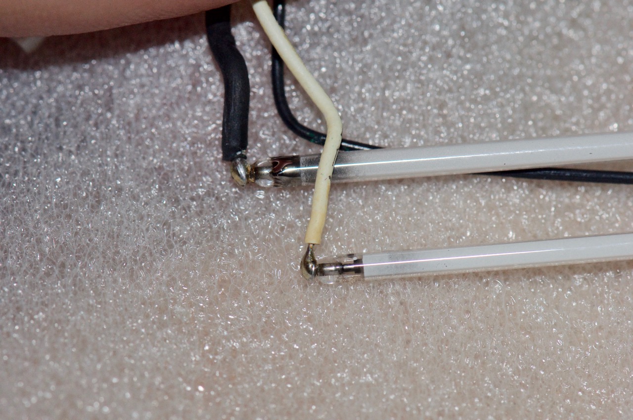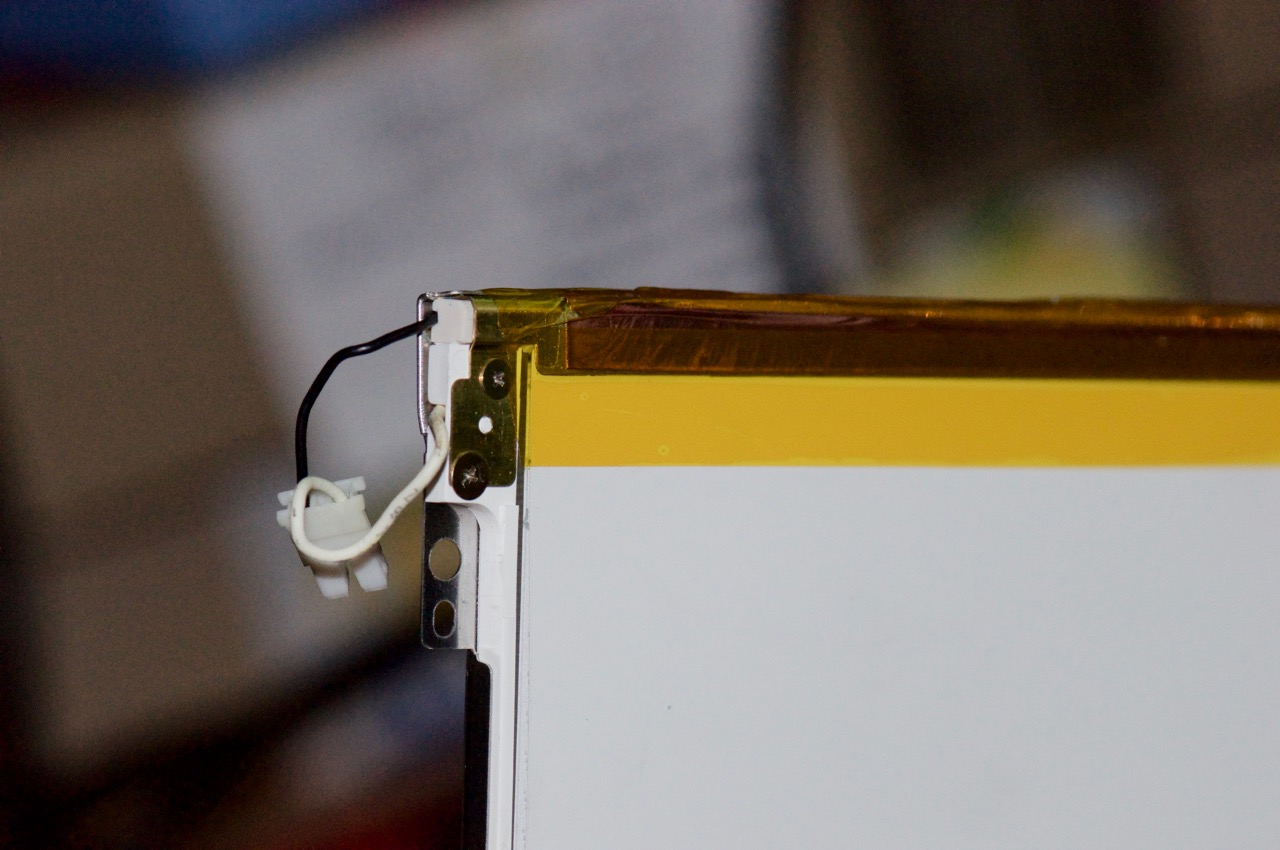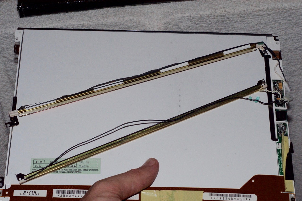 9. I did a bit of a "dry run" by dismantling the 'spares' iBook I mentioned earlier just to get an idea of what is involved. So here I hook up the two CCFL tubes side by side after carefully removing them from their reflective channels. It's impossible to tell here, but the original is the one on the right and the replacement is on the left. They both look bright in the photo, but the different was quite obvious in the flesh.
