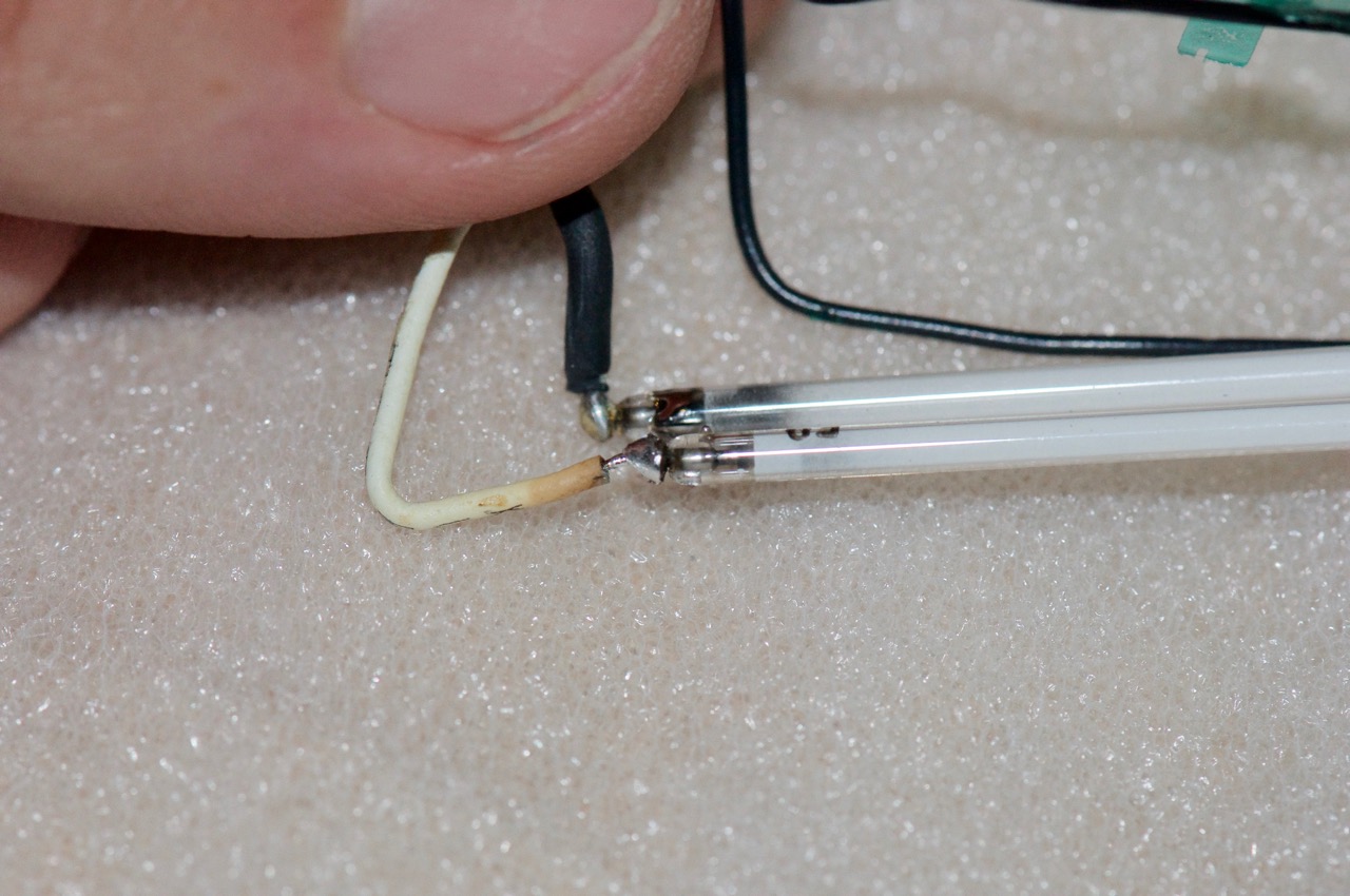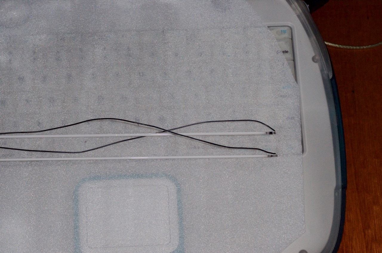 19. I've positioned the black wire end of the tube to be precisely within the end-caps. You can see the darkening of the CCFL tube which usually happens over time creeping into the corner.