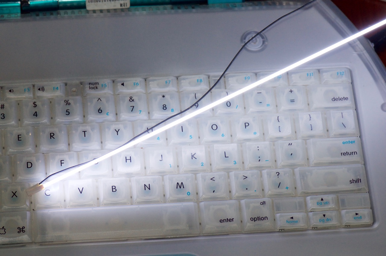 14. Here I've installed the thinner 2mm PBG4 12" CCFL tube into the original Clamshell reflective channel and positioned the black wire to run back along the channel in the white clips.