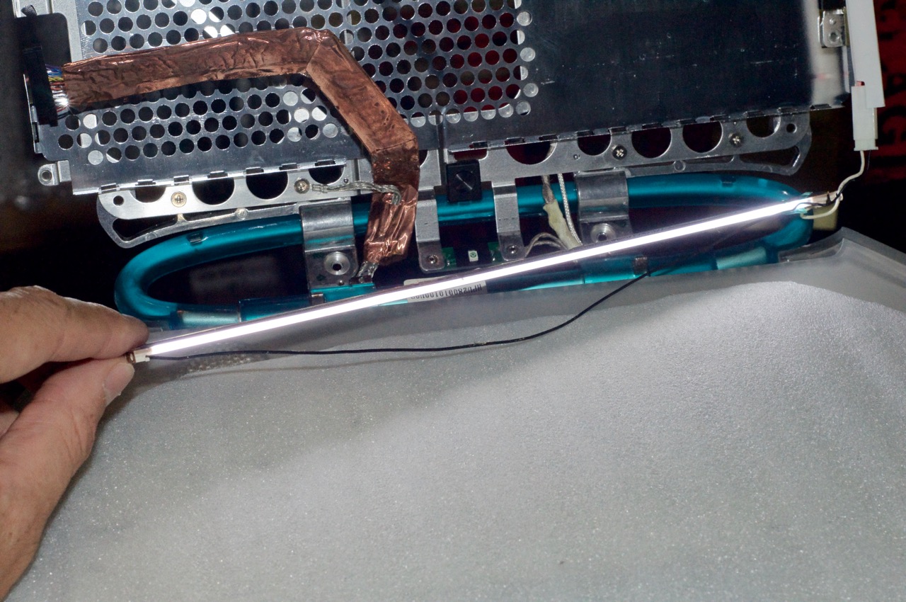 18. Now this is where a whole lot of patience and a little finesse came into play. I had to carefully position the shorter CCFL tube within the channel millimeter by millimeter until I had the ends barely visible. As with all fluorescent, the ends are never as bright as the rest of the tube.