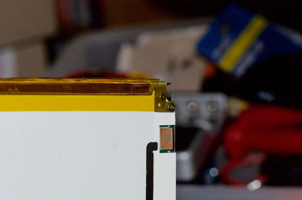 21. Here is the black-wire end after applying the tape. The original copper tape running along the top, which acts as a seal would not re-stick so I just taped it down from above. At this point I should mention that unlike EVERY other LCD panel I have worked on, the Clamshell has a backlight running along the top of the panel, instead of the bottom.