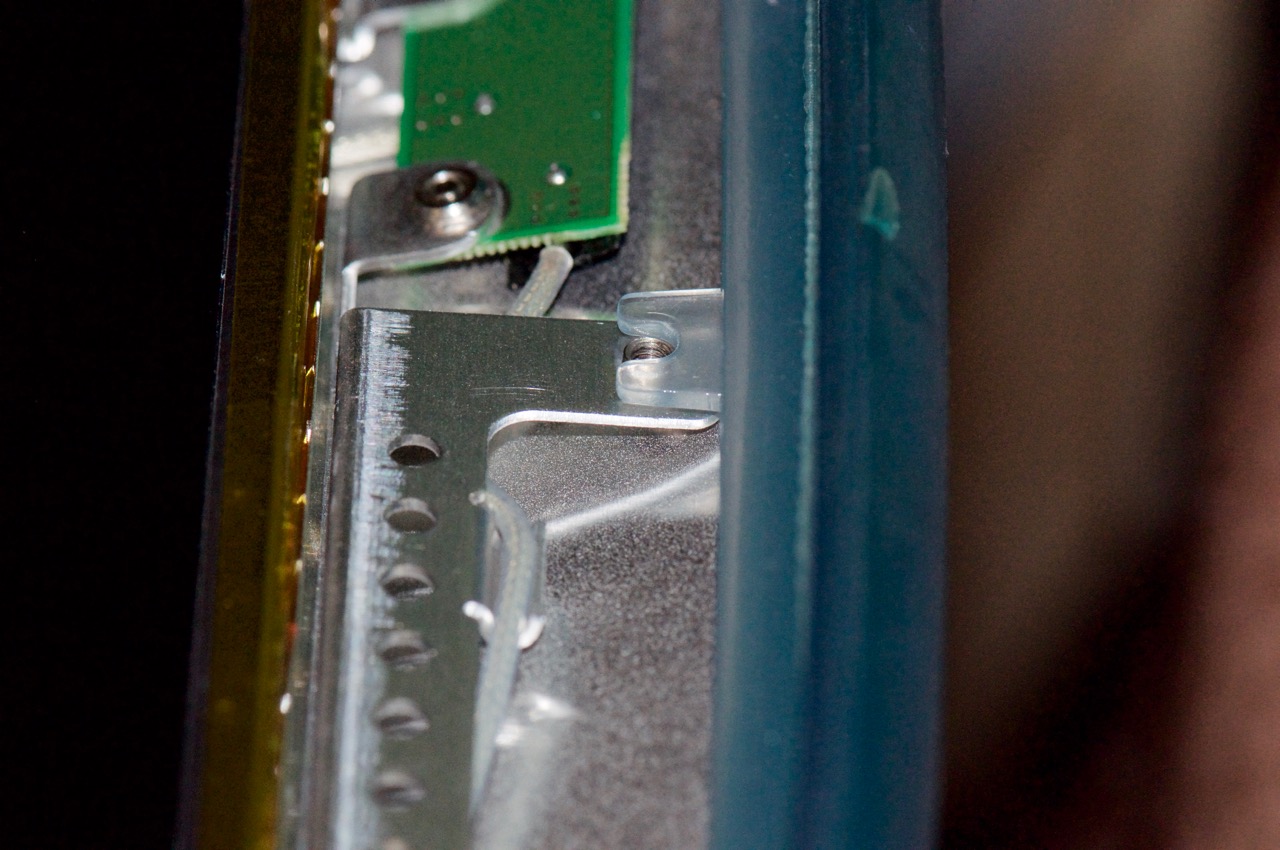 27. So, I began re-assembling the rear panel and front bezel... After getting it back together I noticed the rear housing felt loose, so I unclipped the plastic bezel and went at it again. I discovered that I had not hooked these plastic tabs in-front of the steel inner chassis so the 4 screws running along the top of the display were not connecting with anything.. Here I've hooked the plastic in front of the frame as it should be