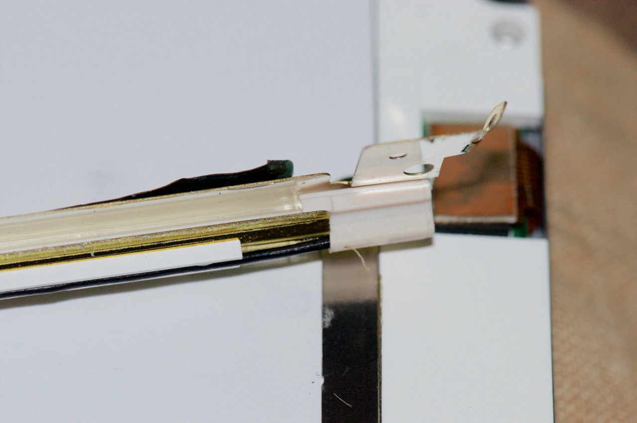 19. I've positioned the black wire end of the tube to be precisely within the end-caps. You can see the darkening of the CCFL tube which usually happens over time creeping into the corner.