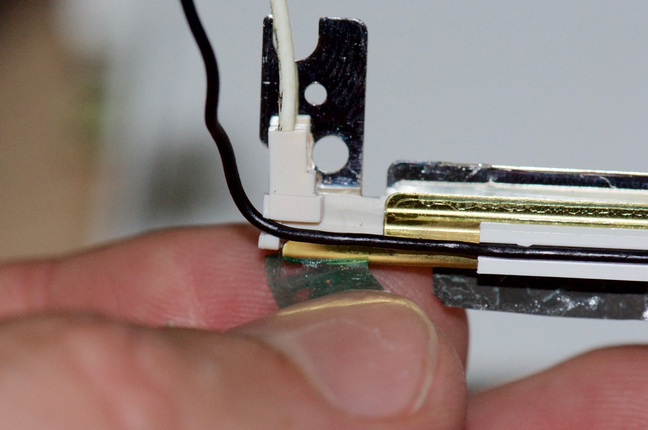 14. Here I've installed the thinner 2mm PBG4 12" CCFL tube into the original Clamshell reflective channel and positioned the black wire to run back along the channel in the white clips.