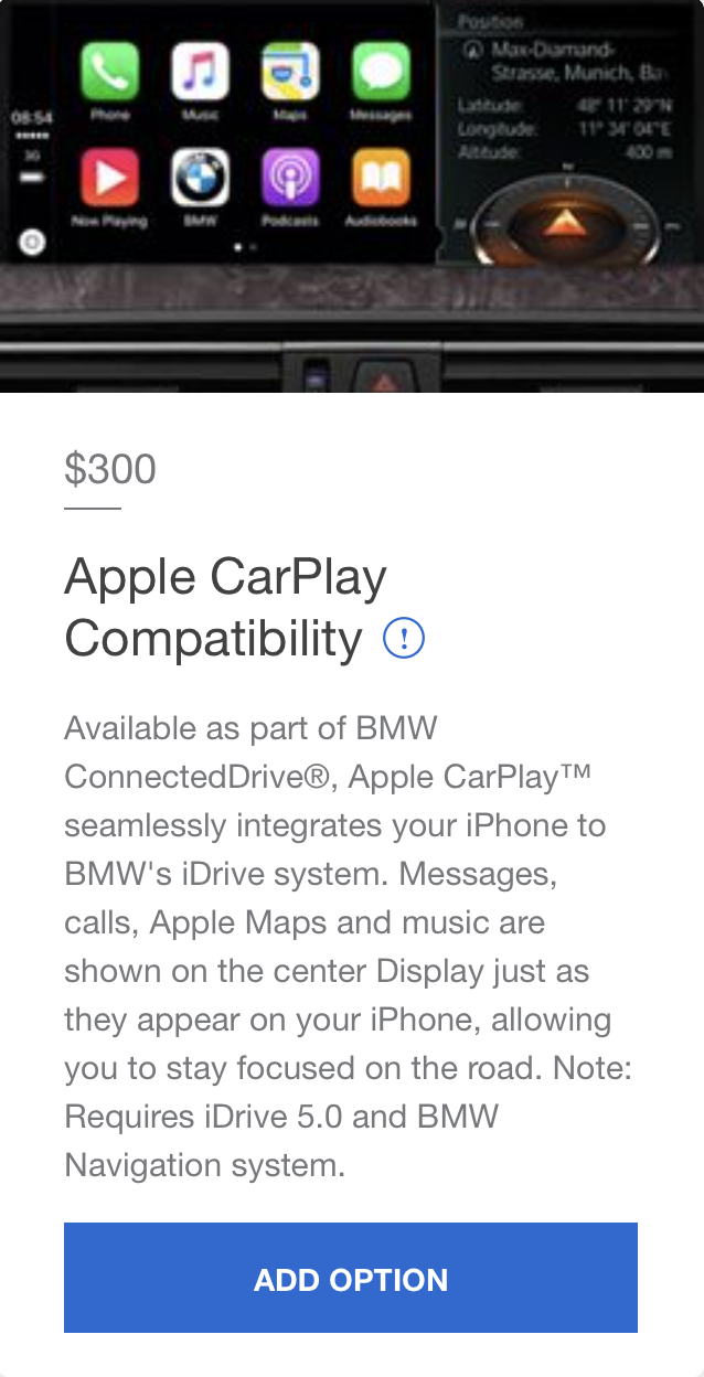 For example, if you go to BMW's web site and pick the cheapest, stripped 320i there is, then jump to options to add CarPlay, you get this showing you need to add the iDrive/NAV for $2,250 extra on top of the $300 for CarPlay. For whatever reason, BMW has always made it somewhat of a bad value to order CarPlay.