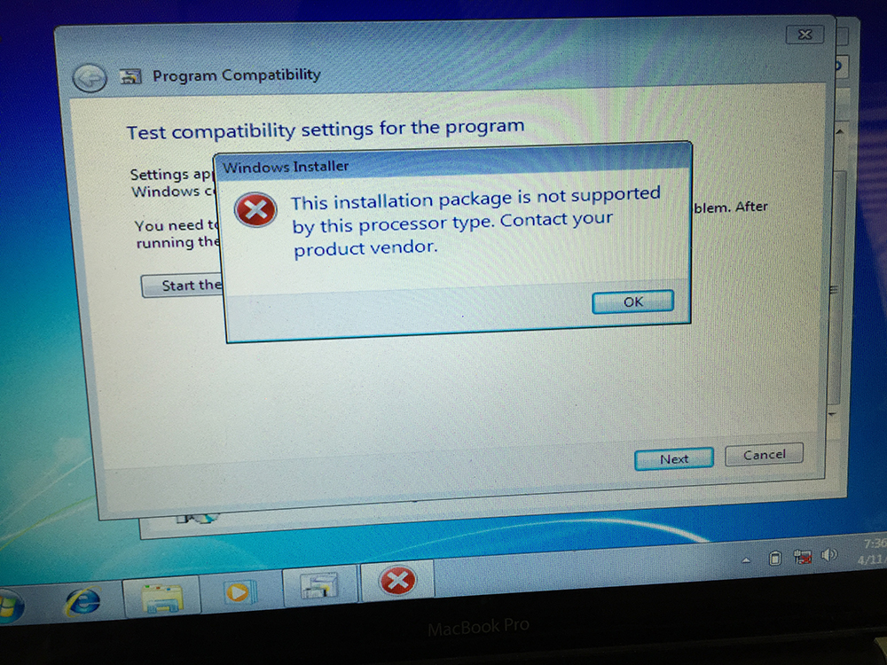 I have a late 2011 MacBook Pro, OS X Yosemite 10.10.2. I installed Windows 7 (64-bit) via Boot Camp and it worked fine, the problem now is that the drivers I downloaded (5.1.5621) will not install. It says to check the bit-version or whatever, x86 or x64. Then I tried to troubleshoot the BootCamp.msi file in Drivers/Apple but this happens... (see attachment). Thanks for the help.