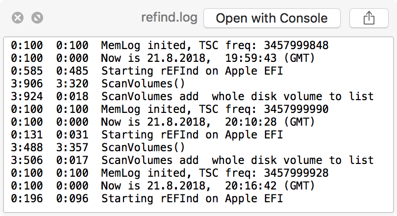 rEFInd log shows the following for all 3 tests