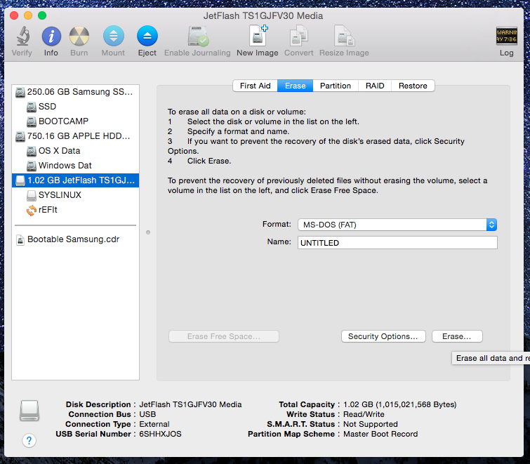 9. Go to the erase tab and format it to MS-DOS (FAT) by clicking Erase. Wait for it to finish.