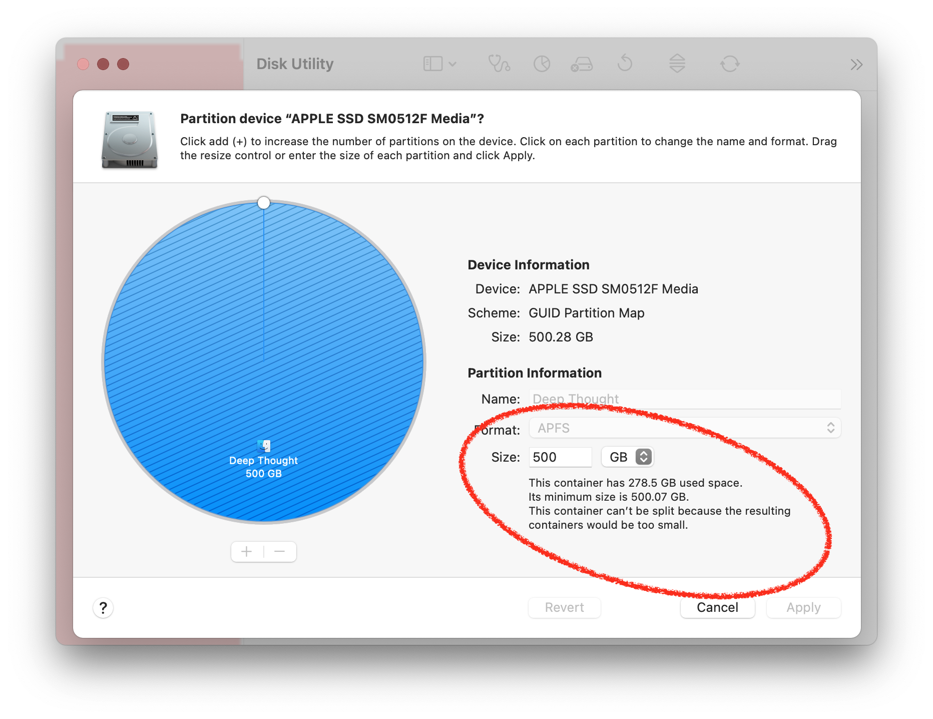 I’m unable to partition my 512GB SSD even with 225GB free space available. I’ve deleted all local TimeMachine backups, disabled external backups on TimeMachine, thinned with urgent tmutil thinlocalsnapshots / 1000000000 1