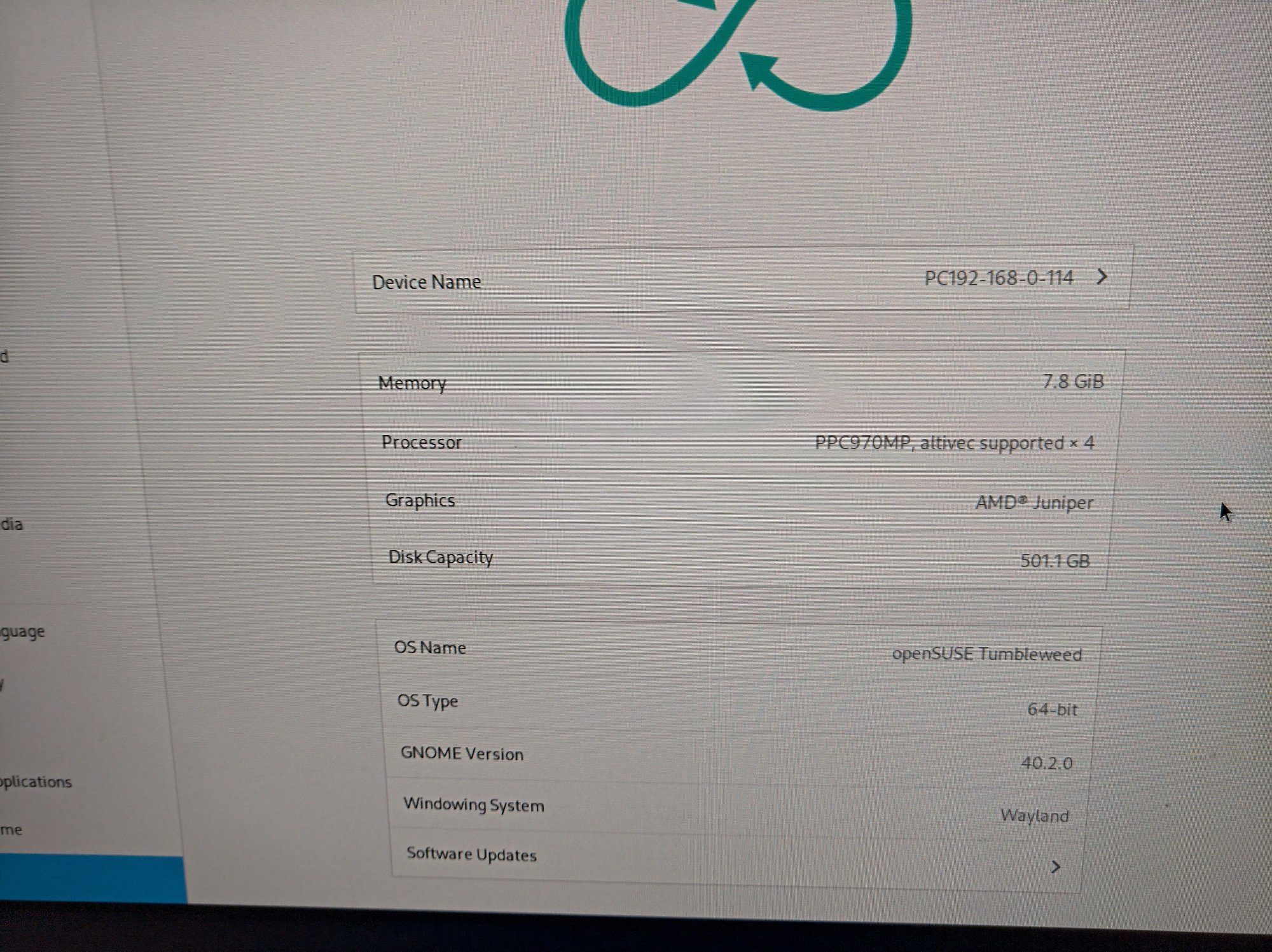 OpenSuse is pretty snappy on the PM G5 quad and, frankly, visually quite impressive. OpenGL and OpenCL work fine, there is out-of-the-box support for Radeon HD cards AND unlike under Ubuntu and Debian, Gnome/Wayland is fully supported on the GF7800 GTX (only flashback works with the latter under those). If you do end up using the GF7800 GTX change your grub append to: