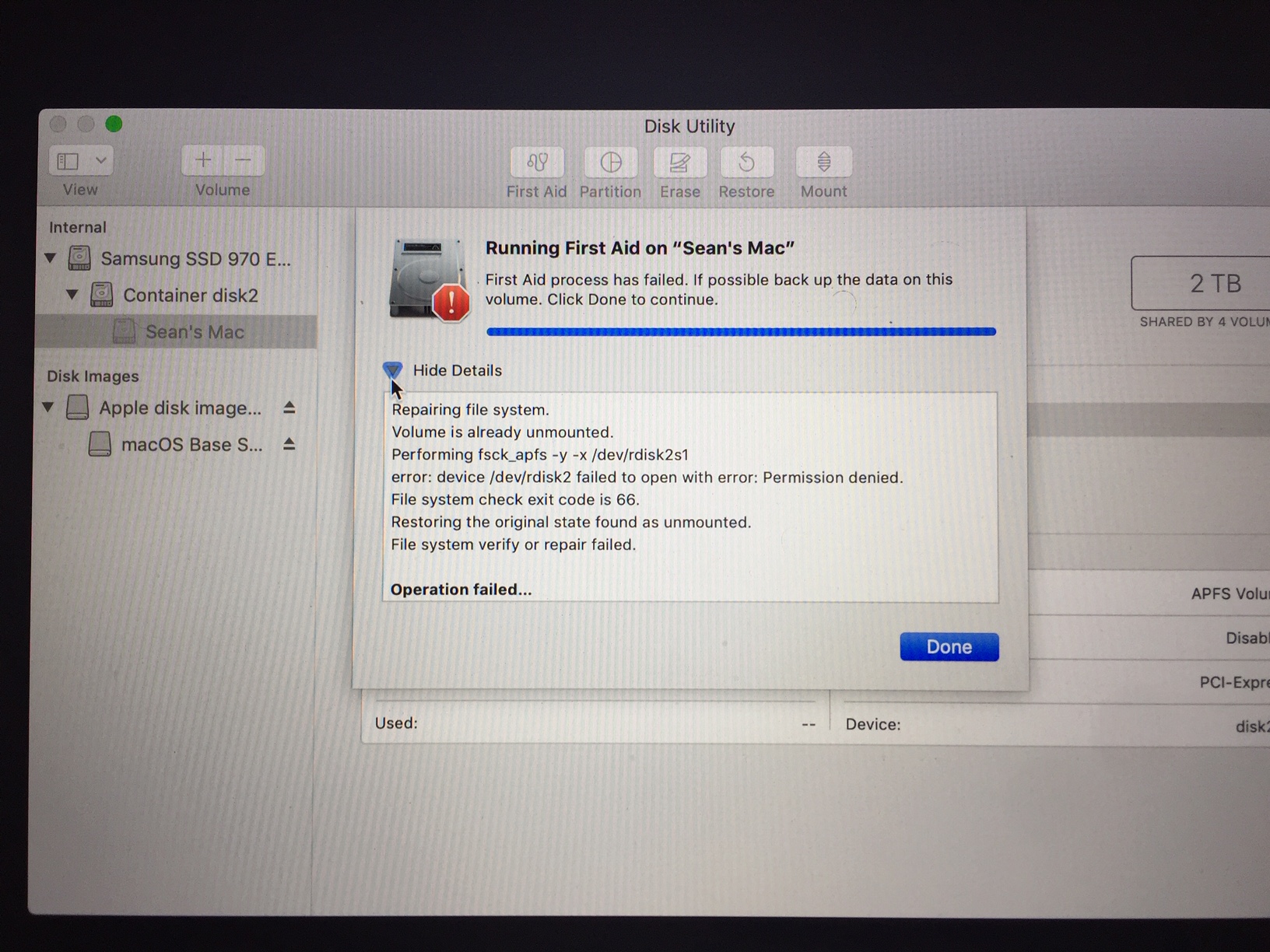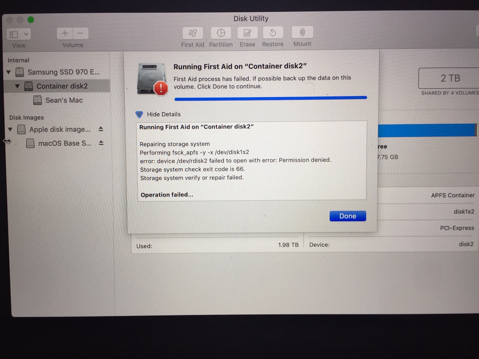 First Aid process has failed. If possible back up the data on this volume. Click Done to continue.