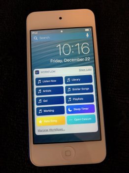 So back in June I purchased a blue 128GB iPod Touch (never owned a device with a white front - want to be "whimsical" I guess). I set it up using iTunes, never singed into iCloud, disabled all notifications, and tried to create a lean experience for music. I use the Workflow app to create a widget to play playlists (each section of the widget is actually a folder for playlists) so I can often shuffle my music from the lock screen.
