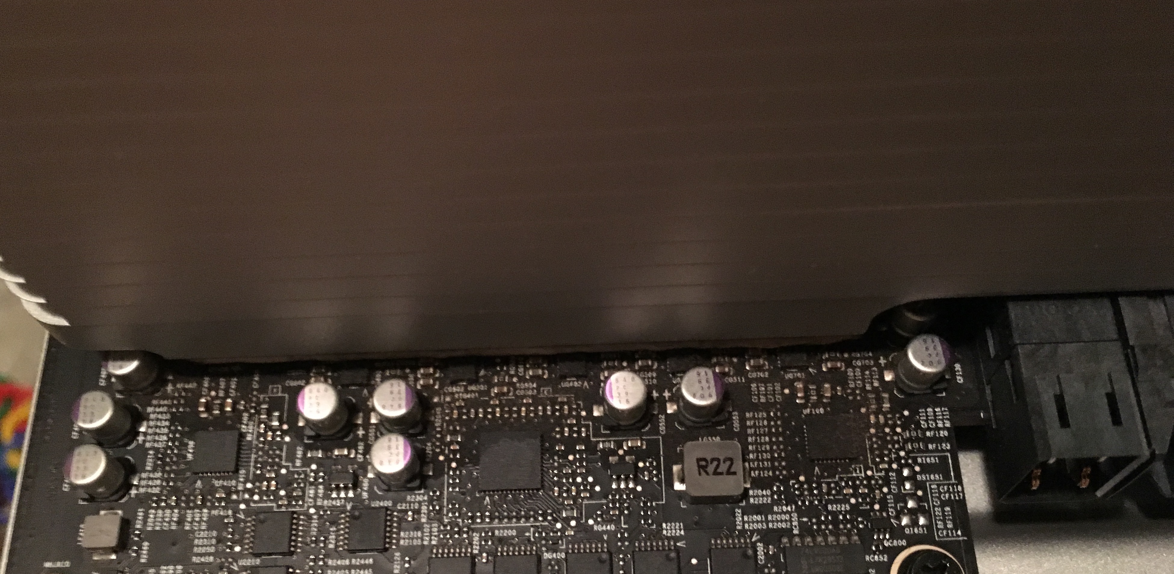 At first I thought it was some components on the board that had failed and were leaking fluid, but looking a second time, it looks more like the residue came from the thermal pads (or the adhesive on them) on the heat sinks. At least the machine is still working fine. Unfortunately a dual CPU tray seems to cost about as much as an entire system.