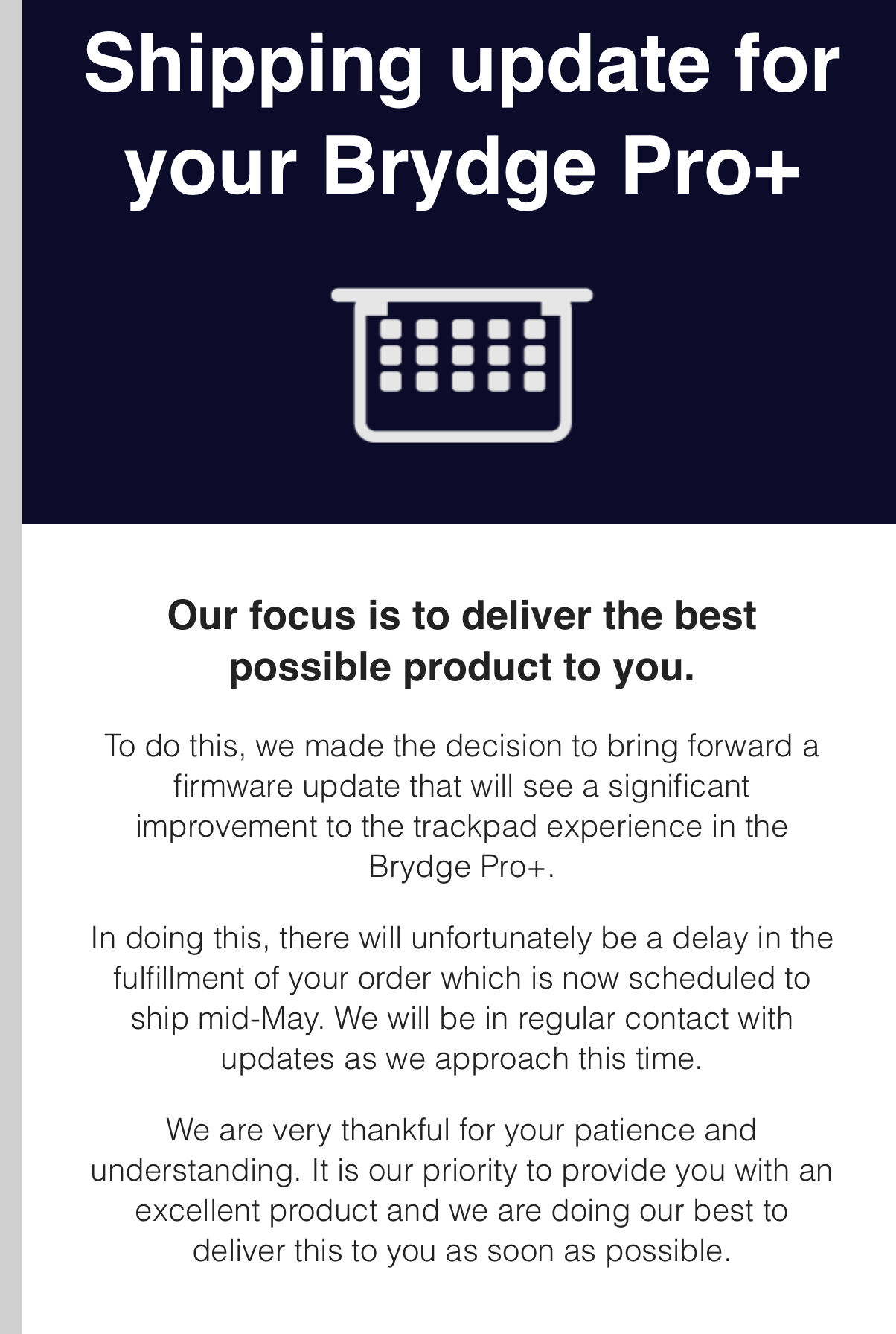I'm in the same boat as you, ordered mine right away in January. If you remember correctly when the product was first announced it was advertised as using Bluetooth 4.1. NOW if you look on their website its advertised as using Bluetooth 5.0. I'm wondering if there's been a silent hardware revision and early pre-orderers are getting an inferior product. I emailed them last night but haven't heard back anything yet. I suggest anyone who ordered the keyboard early on to contact Brydge and ask them if they made any hardware changes. If the early keyboards use Bluetooth 4.1 I'm gonna be very upsetRight away. One of the first. But what's the point if it won't be up to par for weeks. I wouldn't mind waiting.