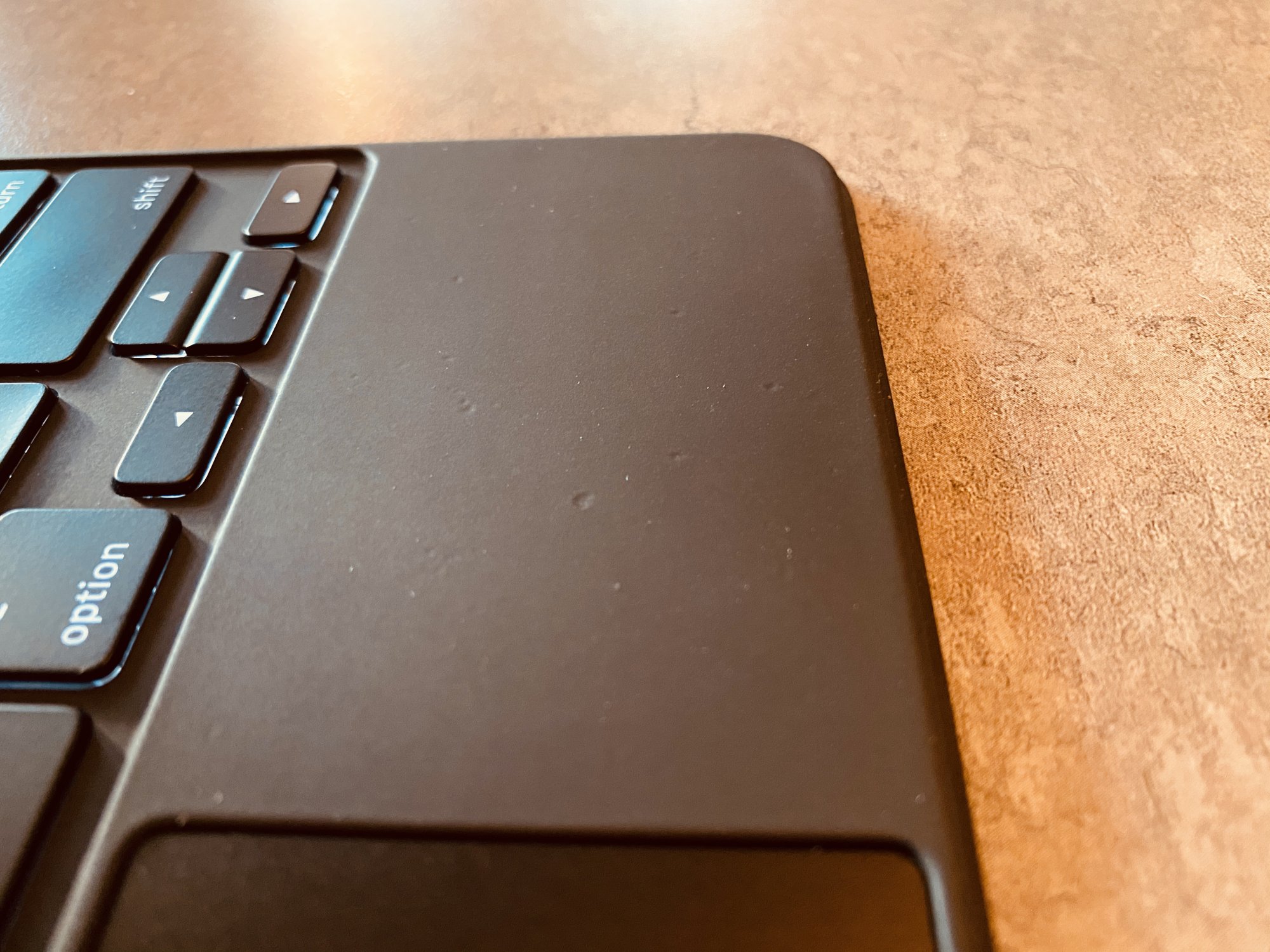 so returned it got a replacement and this one has a few pin holes again showing the metal underneath and also a dip in the material just above the number 3 key which is likely due to a component slightly sunk in the body (as pictured), I think in about 70% of cases you will get the magic keyboard with marks, pin holes, pitting, cracks etc... only a small amount are coming flawless unfortunately, and for a product at this price I expect far better QC from Apple, but it mostly boils down to that rubber material.