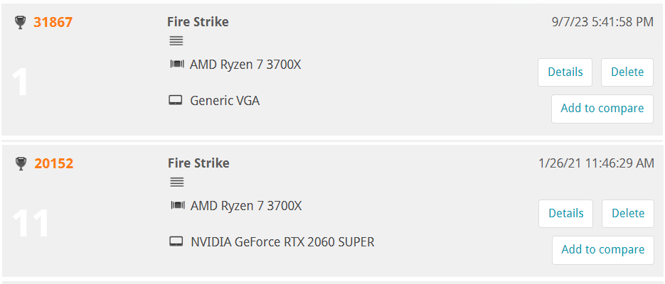 Here's a couple of comparisons from 3DMark, I'm getting 16478 vs. 8935. Nearly double the performance over the 2060 on the time spy.