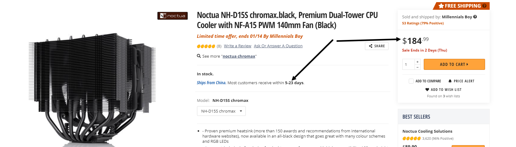 Nah, this is price gouging driven by demand. As Thysanoptera mentioned, the brown version of the D-15S is easy to find. I looked at the prices of Noctua's benchmark 120mm brown fans:Wow the D15S is hard to find. MicroCenter has the non-black Chomax version for 109 and here's the only black one in googling. Its from newegg and the price boils down to gouging OR the tarriffs being in affect. I suspect the latter.