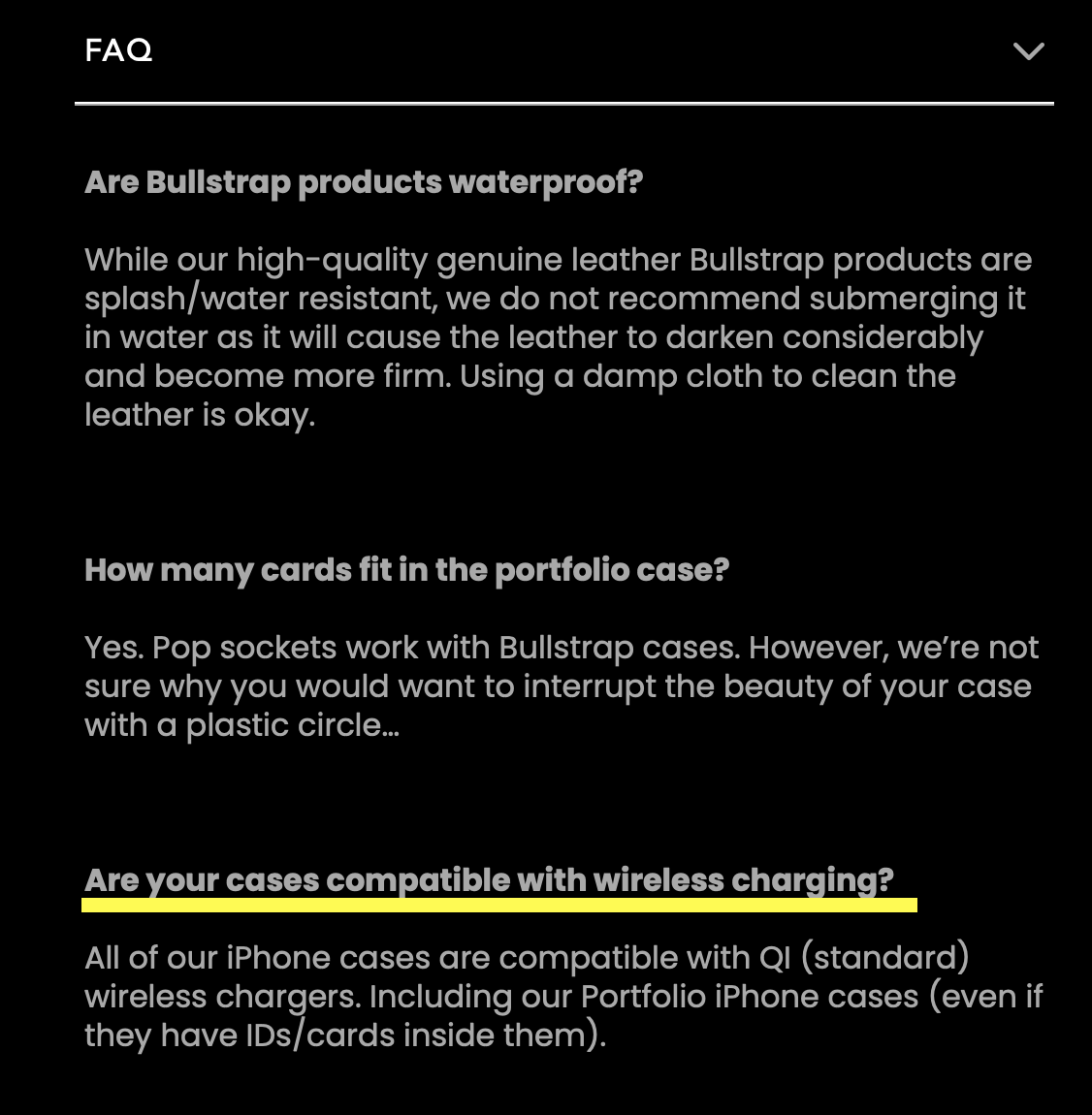 | Hey (my name), Thank you for contacting Team Bullstrap! I do apologize for this, we've run through many tests and have ensured that the portfolio cases are compatible with wireless chargers, even if they have IDs/cards inside them. It could possibly be your wireless charger, or that the phone isn't aligning with your wireless charger. I do apologize for this but unfortunately there is nothing further we can do. All the best, (Name)-Team Bullstrap” They say on their website that they are compatible. And when I tell them there is an issue, this is the first and ONLY response. Not “Oh, let me check with our team” or “let us reach out to Nomad” or “would you like to return it” or ANYTHING other than the response they gave. Maybe I’m expecting too much, but if a company says a product will operate as described, the support should be a little better than this, no? |