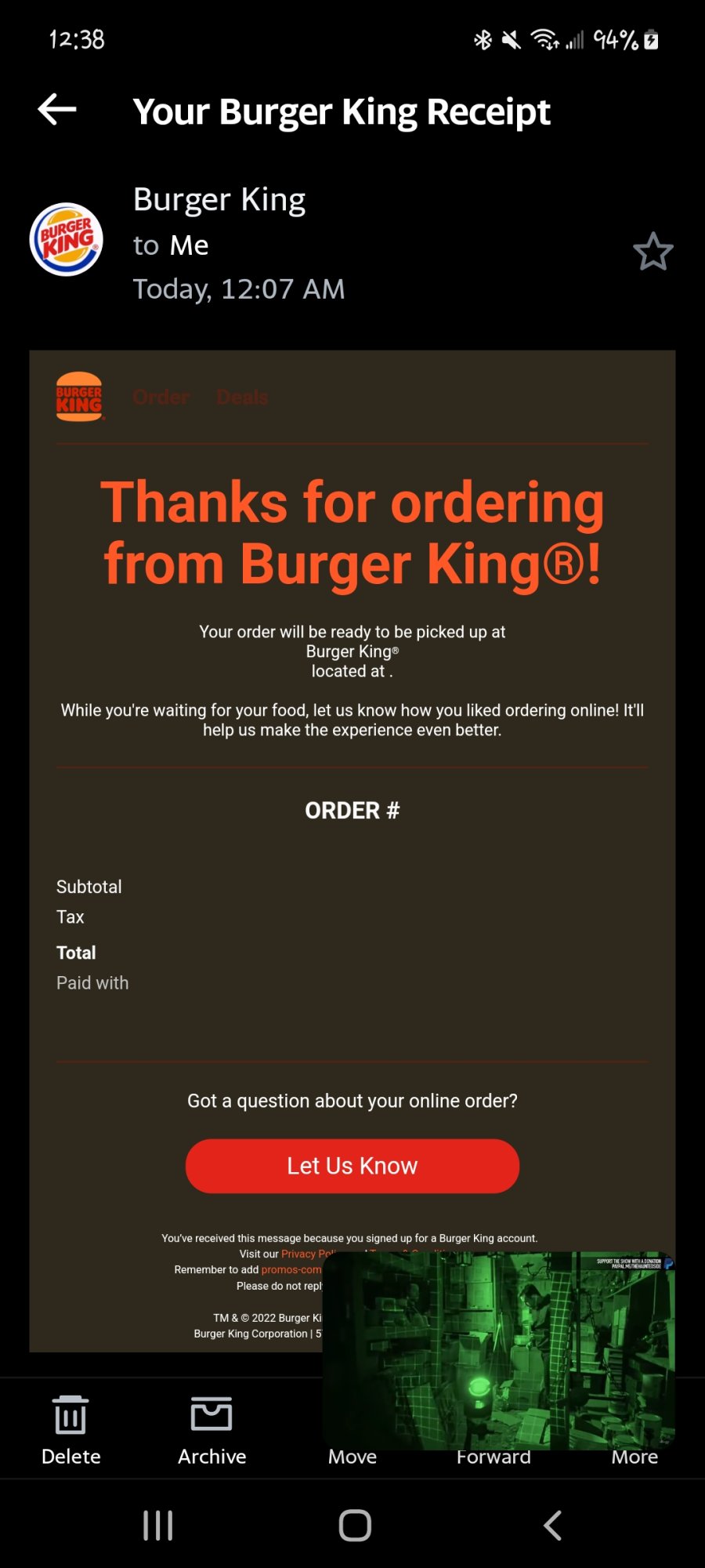 I'm guessing there must be some glitch in their system. I'm just sitting here working and get this email. I do eat at Burger King every 1-2 weeks and always use mobile ordering, but my last order was 4 days ago (and I already received an email receipt for that). This shows a blank order and blank location. I double-checked to be sure there was no pending charge on my credit card and there was not. Very odd!
