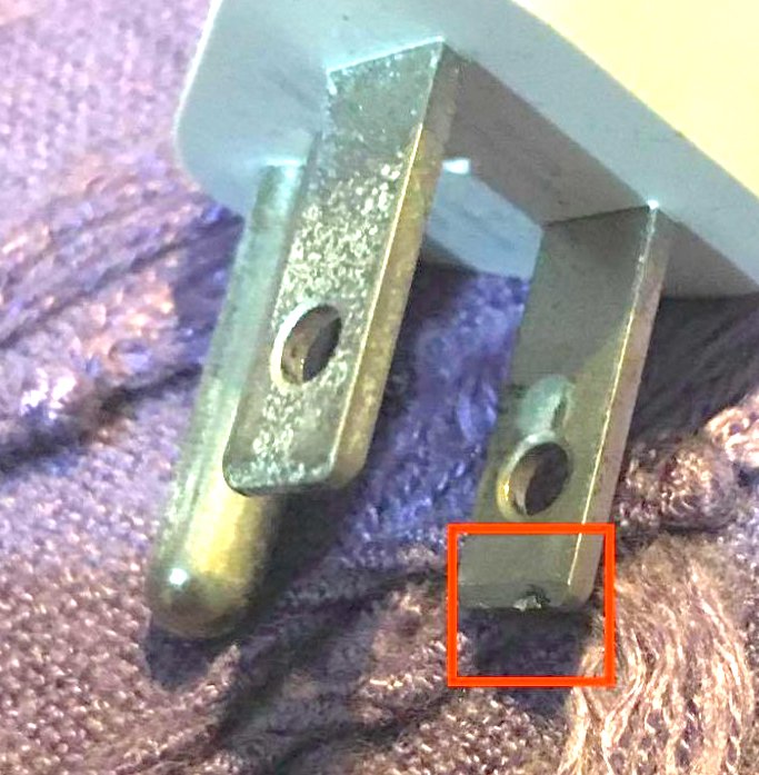 It looks like poor contact between plug and outlet contacts is causing pitting due to arcing?