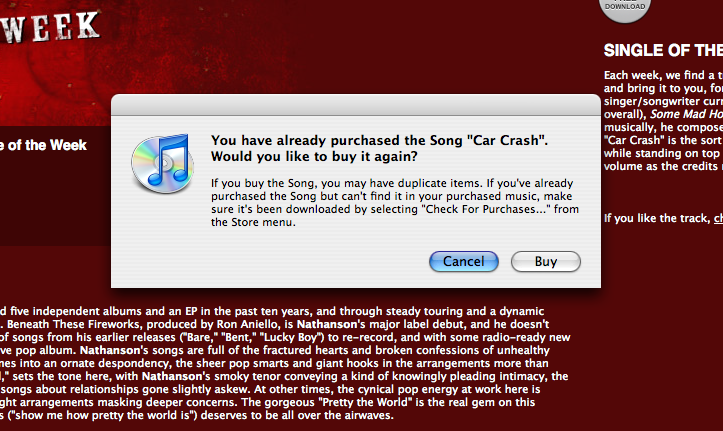 If i have allready purchased a song and its in my purchased folder, if i went back to that song in the future and clicked buy now in the iTunes library, not knowing i've already purchased it, is it going to give me a warning or just download it twice and charge me?.