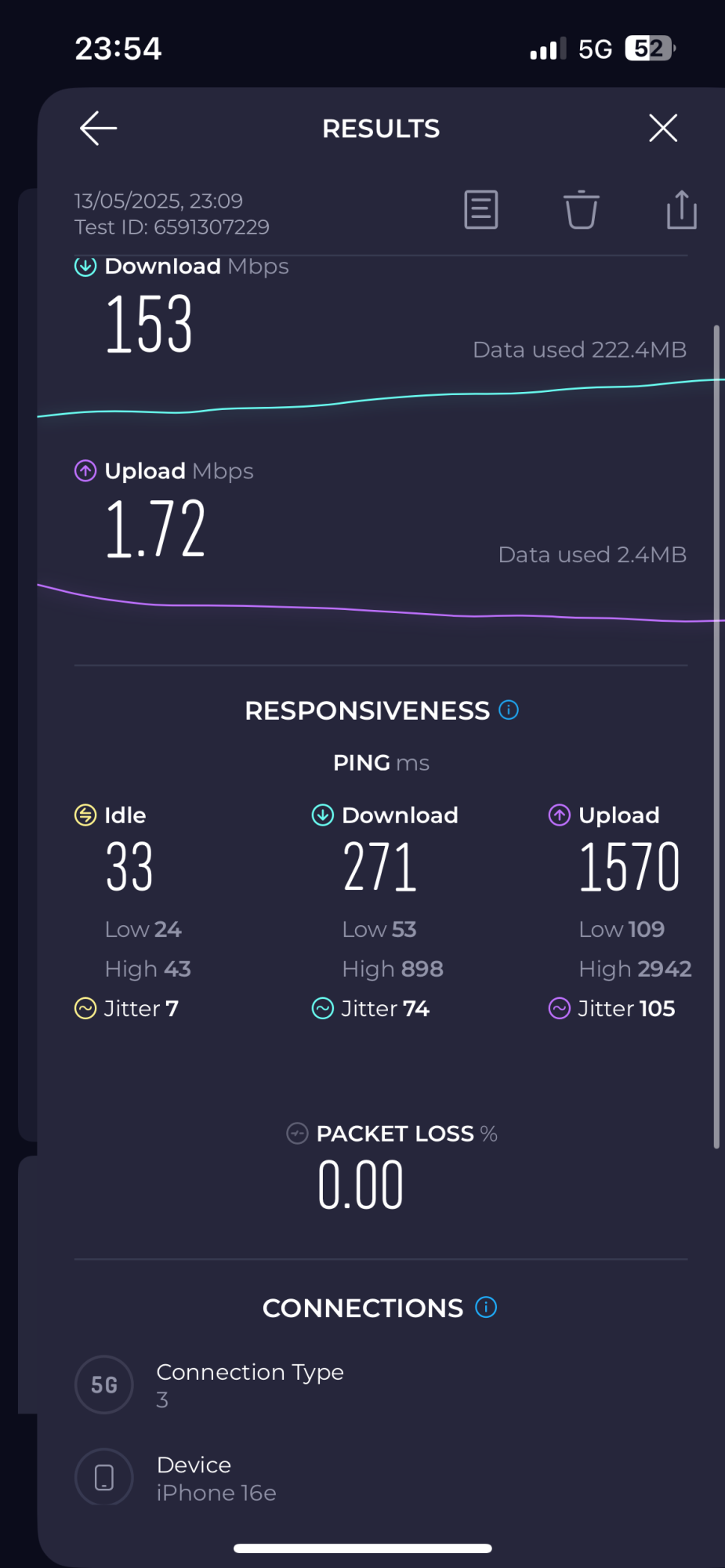 Upgraded from iPhone 14 Pro to iPhone 16e and I’m really disappointed with the down/upload speeds. Connected to the same network, speeds are as follows: